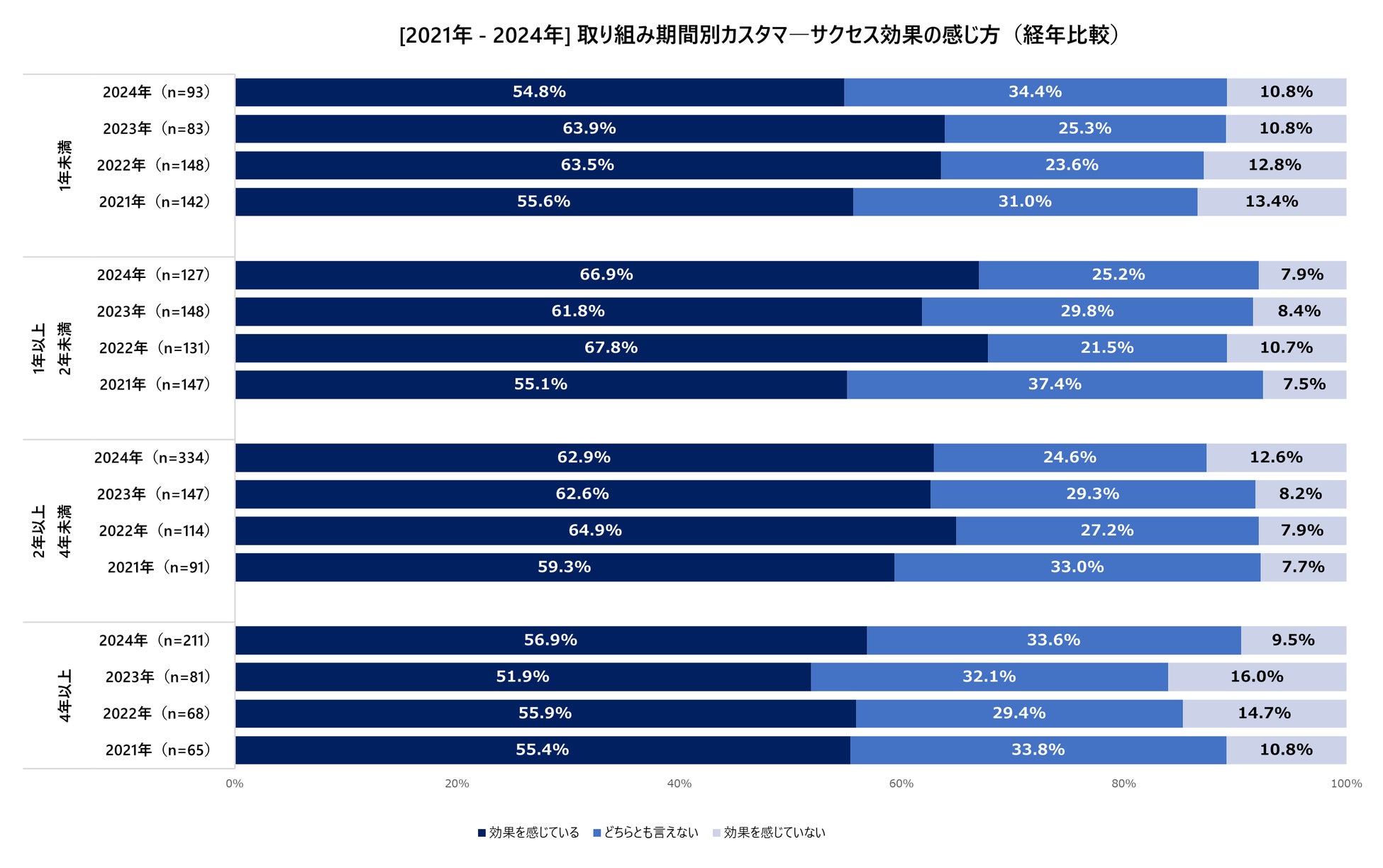 カスタマ―サクセス取り組み期間別で見てみると、取り組み期間1年未満の層で「効果を感じている」人の割合が昨年より9.1ポイント減少しているものの、それ以外のセグメントでは効果を感じている人の割合が昨年を上回る結果となりました。取り組み期間に関わらず効果を感じている人の割合が半分を超えていることから、短い期間で効果を出せていると感じている人がいると同時に、取り組み継続していてもなかなか効果を体感できない、という人も一定数いることがわかります。