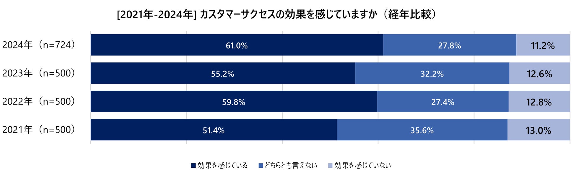 カスタマーサクセス取り組みの効果としては、昨年より5.8ポイント増で61.0%の人が「効果を感じている」と回答。直近3年間と比較しても最も高い割合でカスタマーサクセスの効果が感じられているという結果となりました。