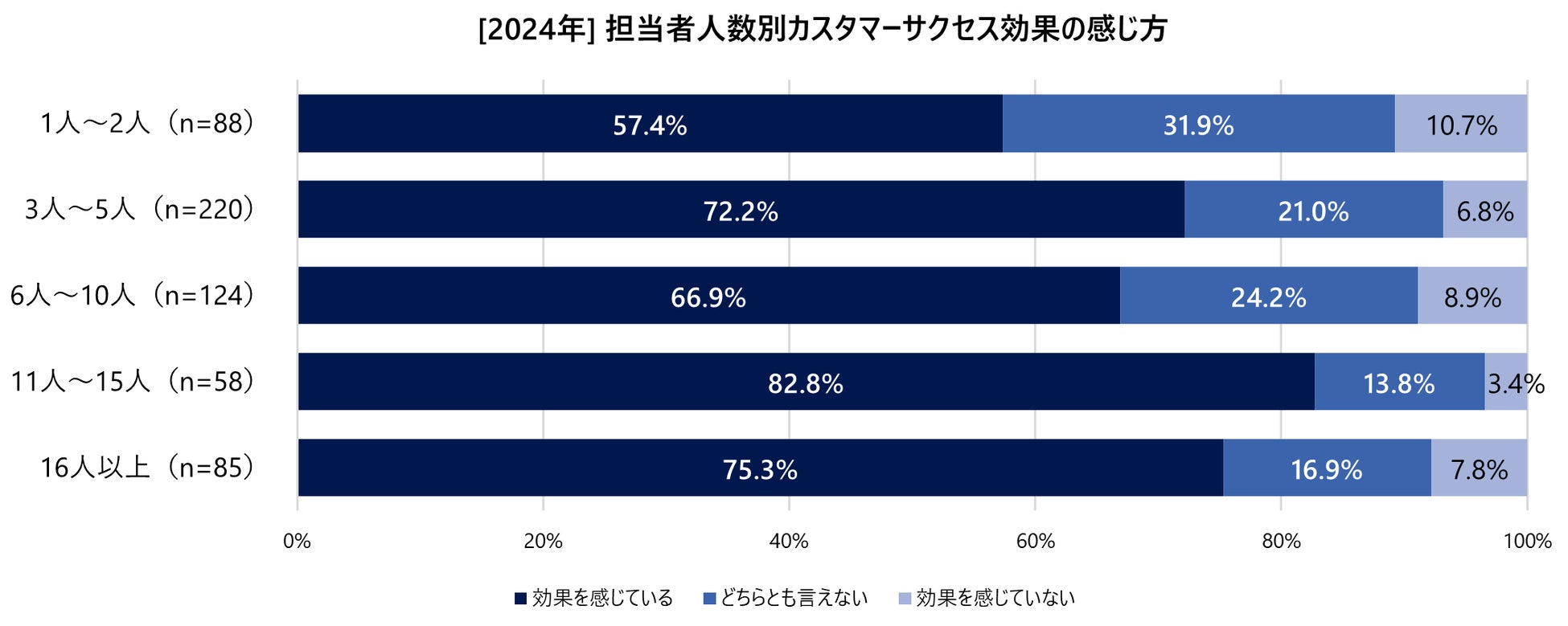 同じく効果の感じ方をカスタマ―サクセス担当者人数別で見てみると、もちろん事業所の規模にもよりますが、カスタマーサクセス担当者の人数が少ない場合でも半数以上の人が、担当者が3人以上いる企業であれば約7割以上の人が効果を体感していることがわかります。
