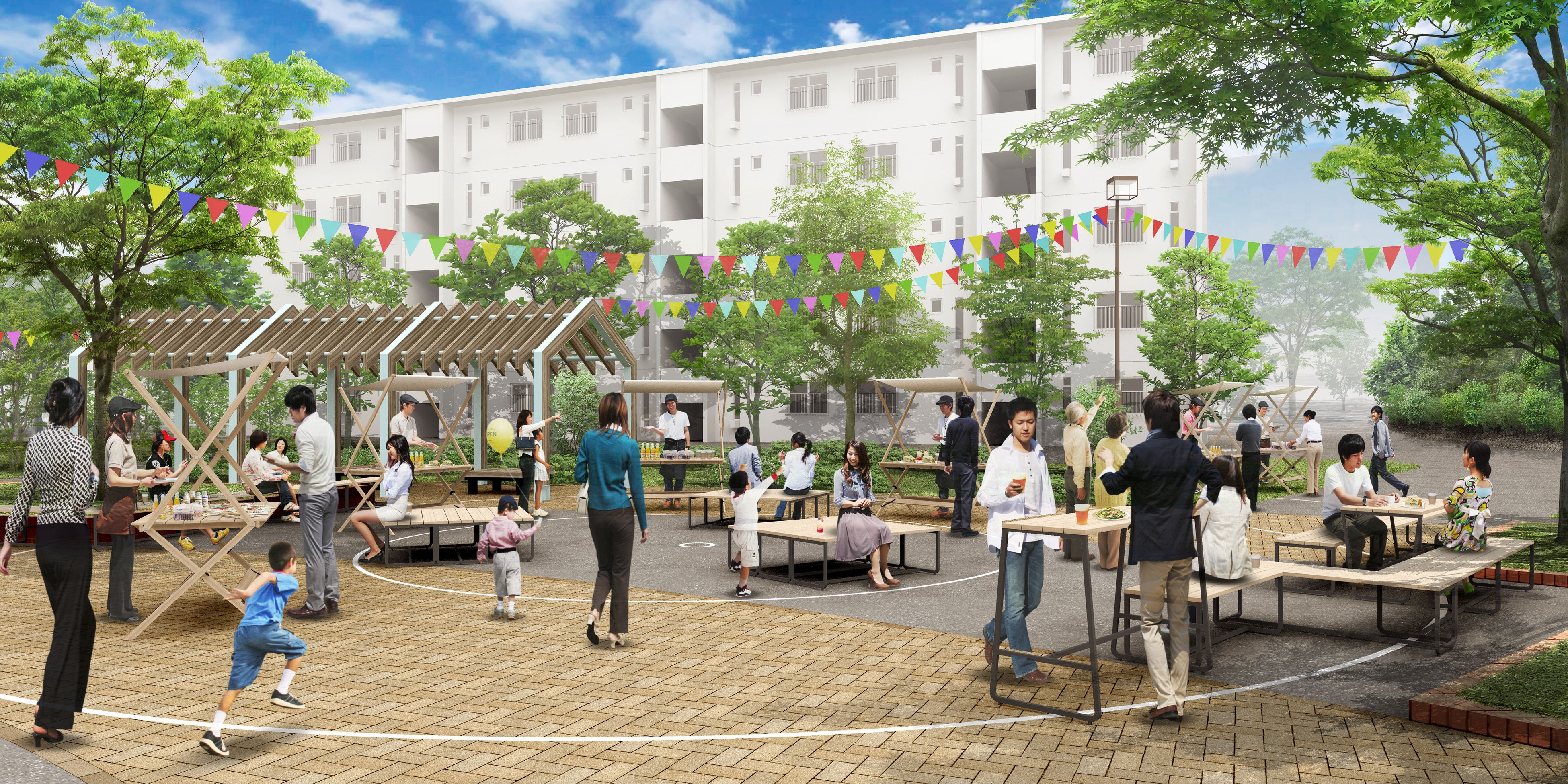 両団地のMUJI×UR団地まるごとリノベーションプロジェクトでは、居住者や地域の方々と一緒に新しい広場空間の使い方を検討しながら、段階的な屋外共用部等のスポット改修と広場を使ったイベントなどを行ってまいります。