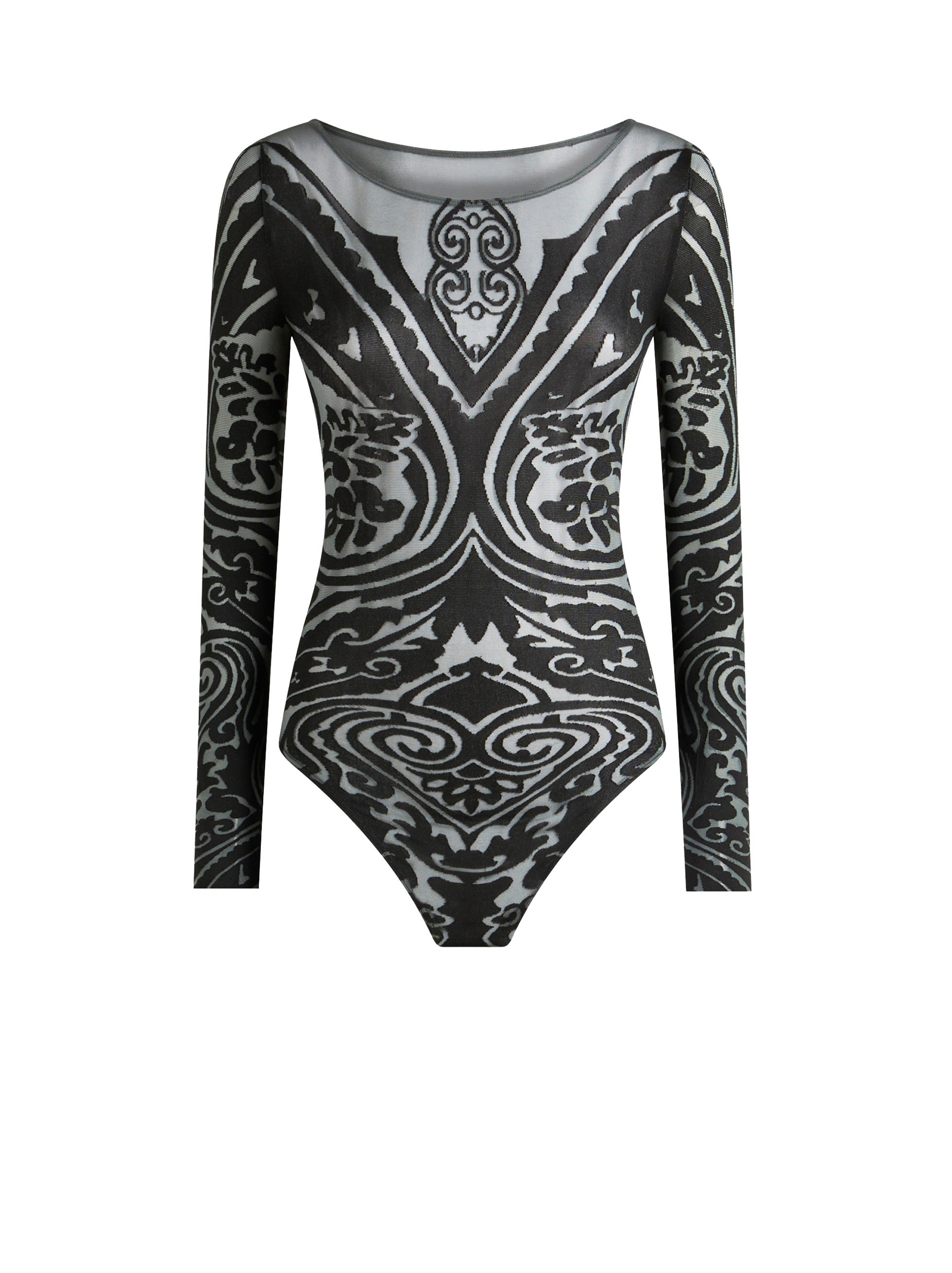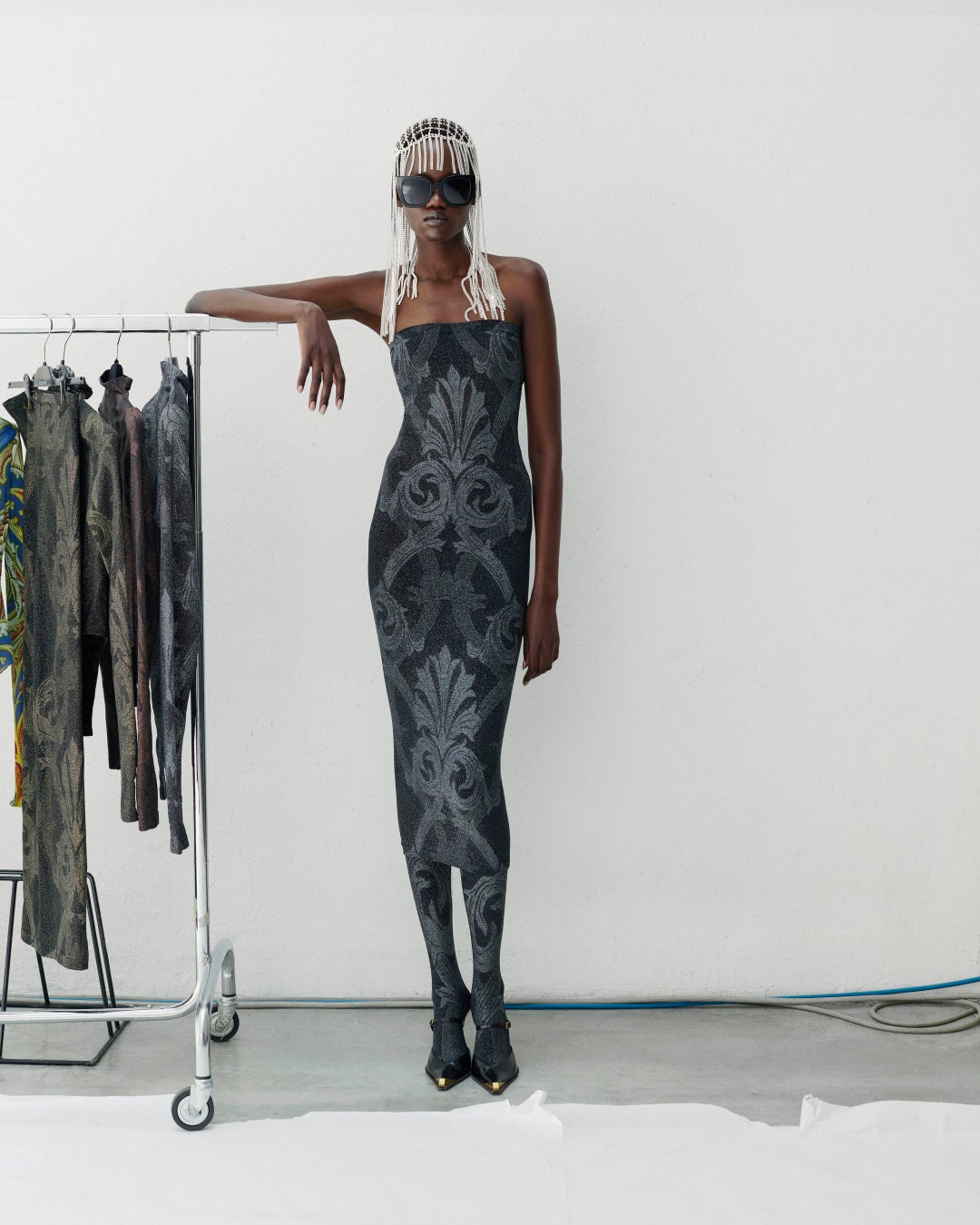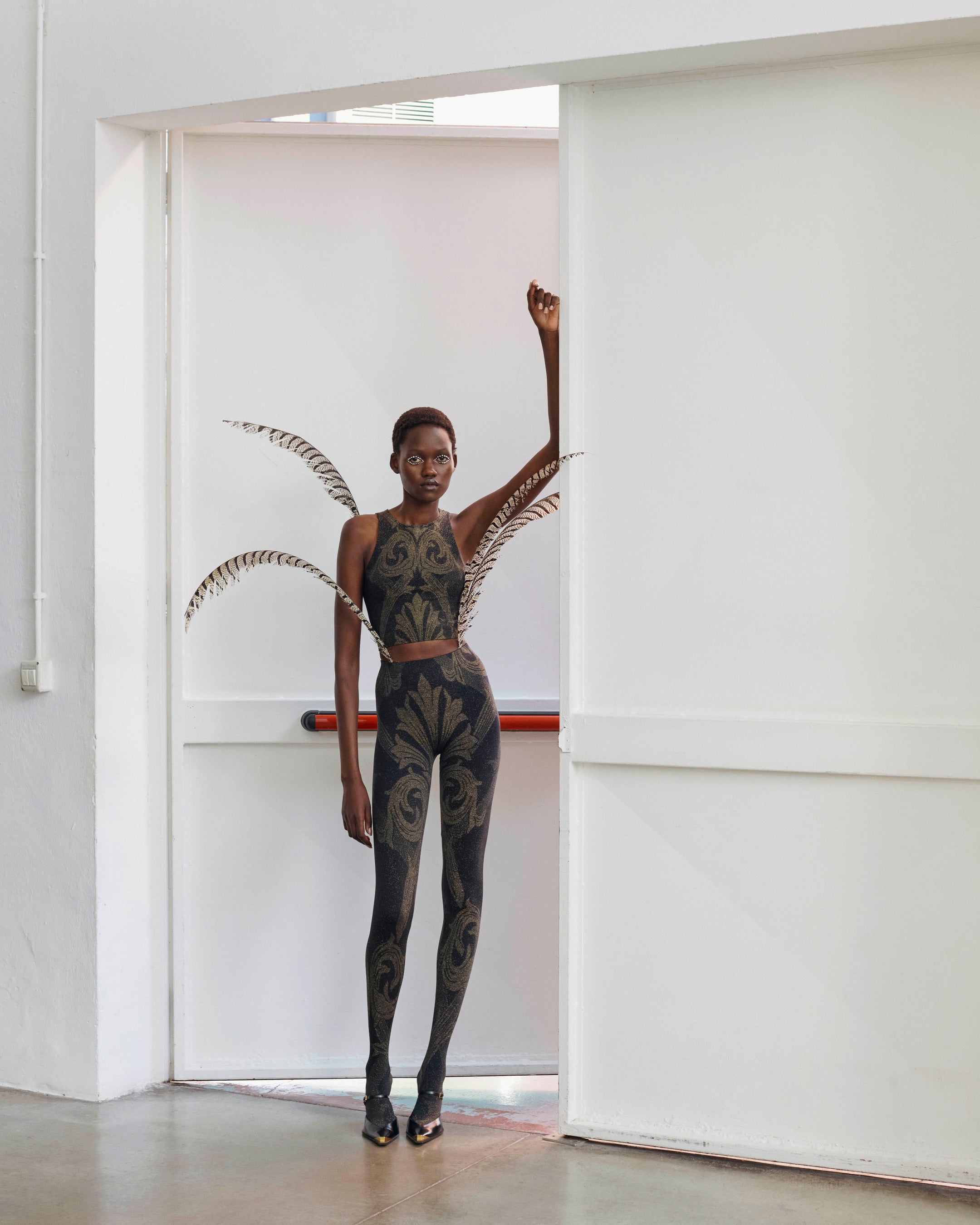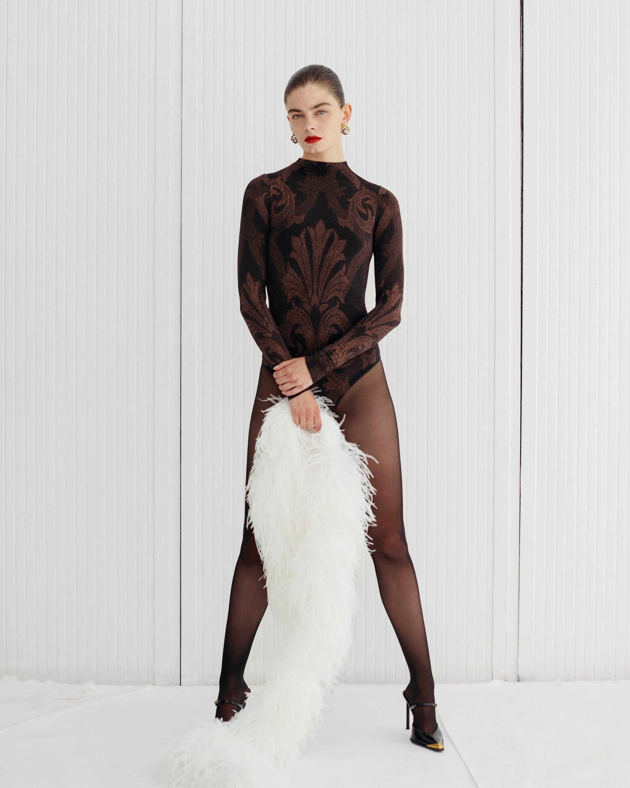 シアーで伸縮性のあるシルエットに新たにデザインされたエトロの特徴的なパターンは、体の曲線に優しくフィットし、動きに応じて滑らかに変化します。ブランドの豊かな歴史を彷彿とさせる独自のモチーフは、繊細な透け感、メタリックなディテールを施したジャカード、光沢のある素材で、ボディスーツ、タイツ、キャットスーツ、トップス、ドレスといったアイテムに表現しています。