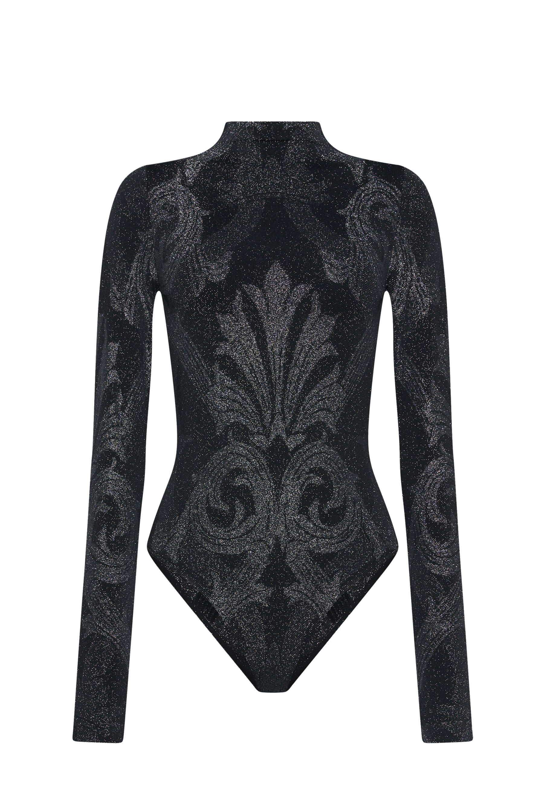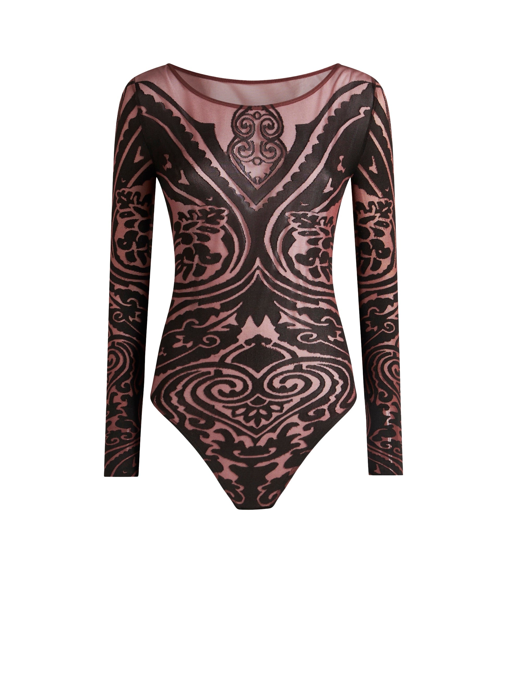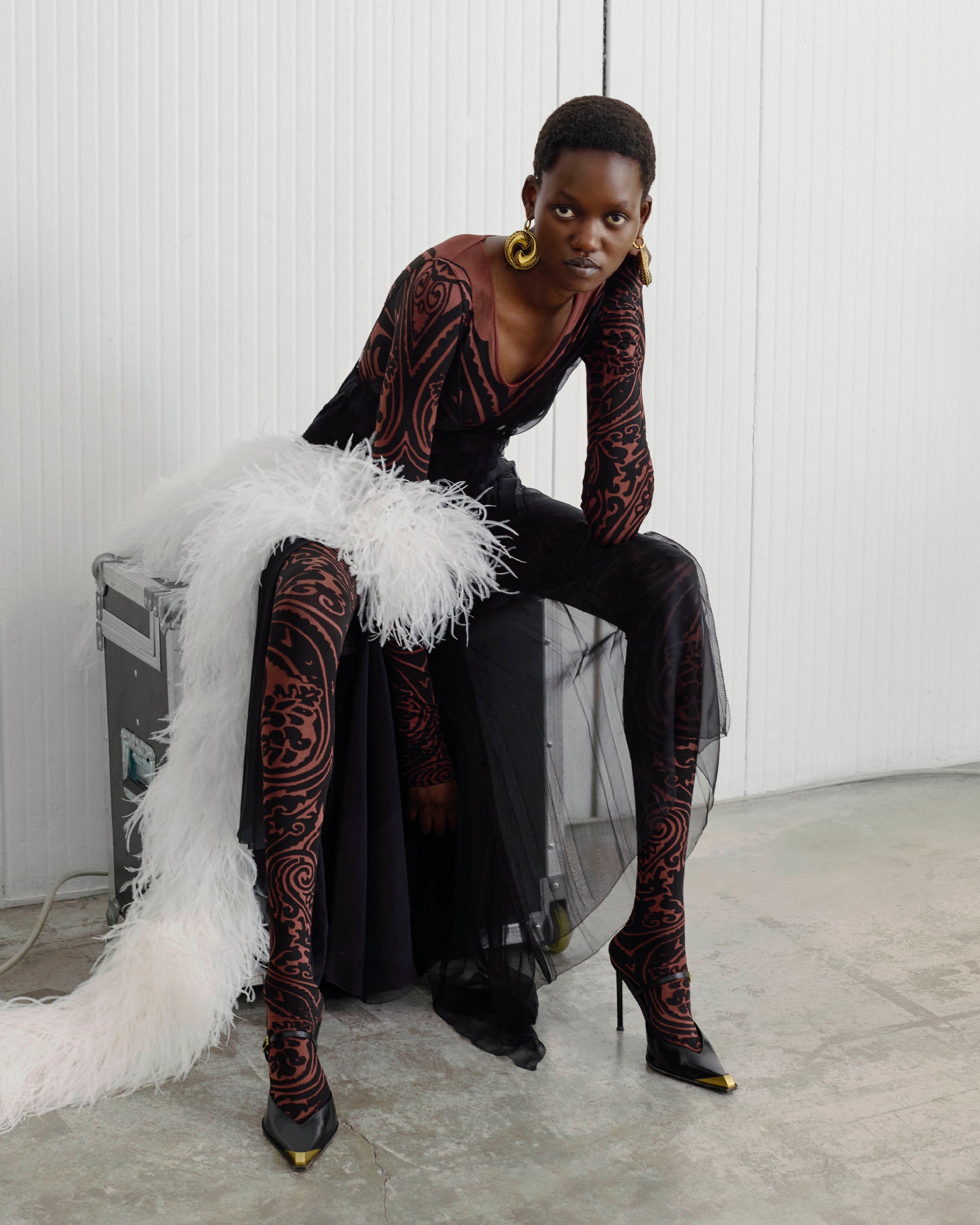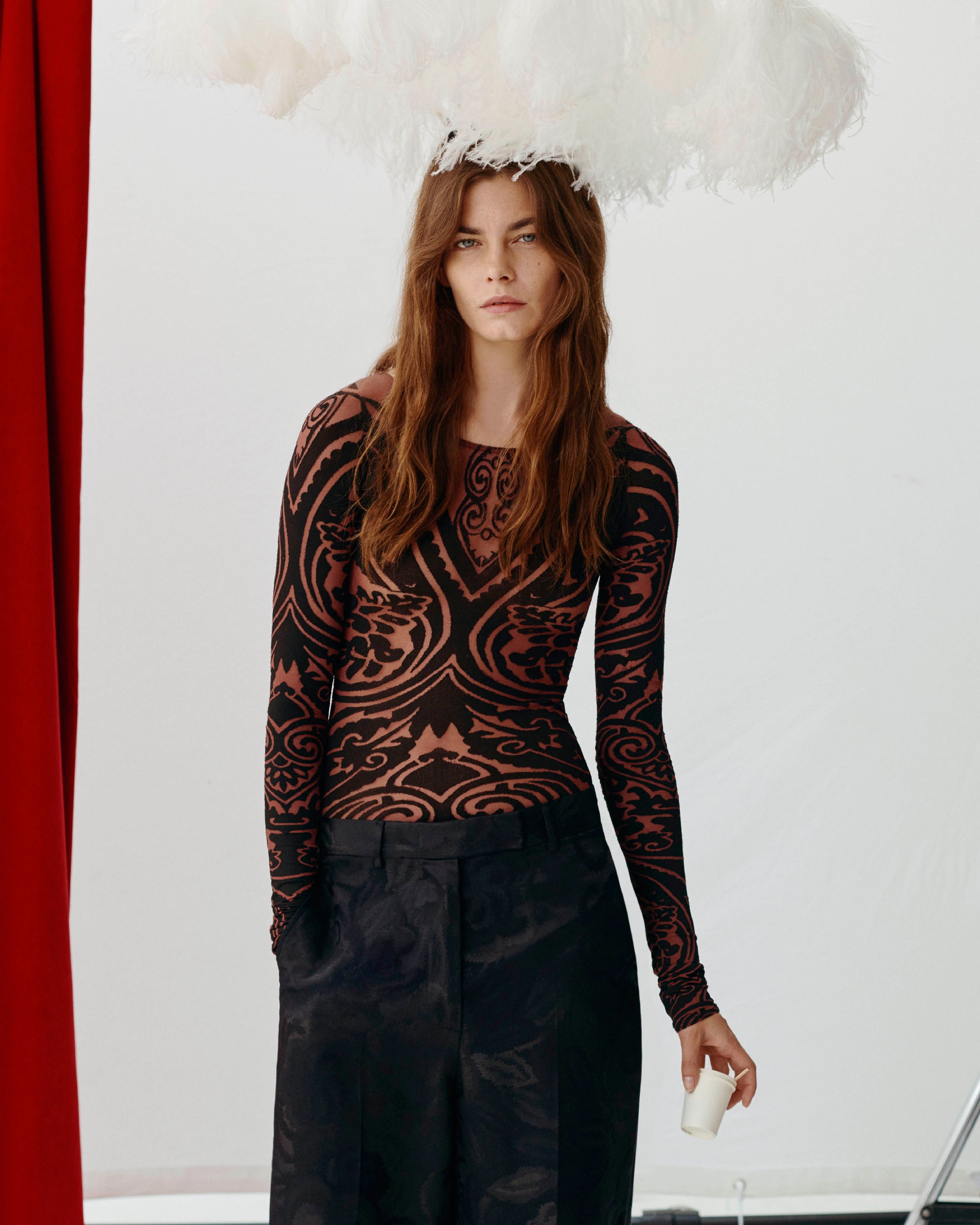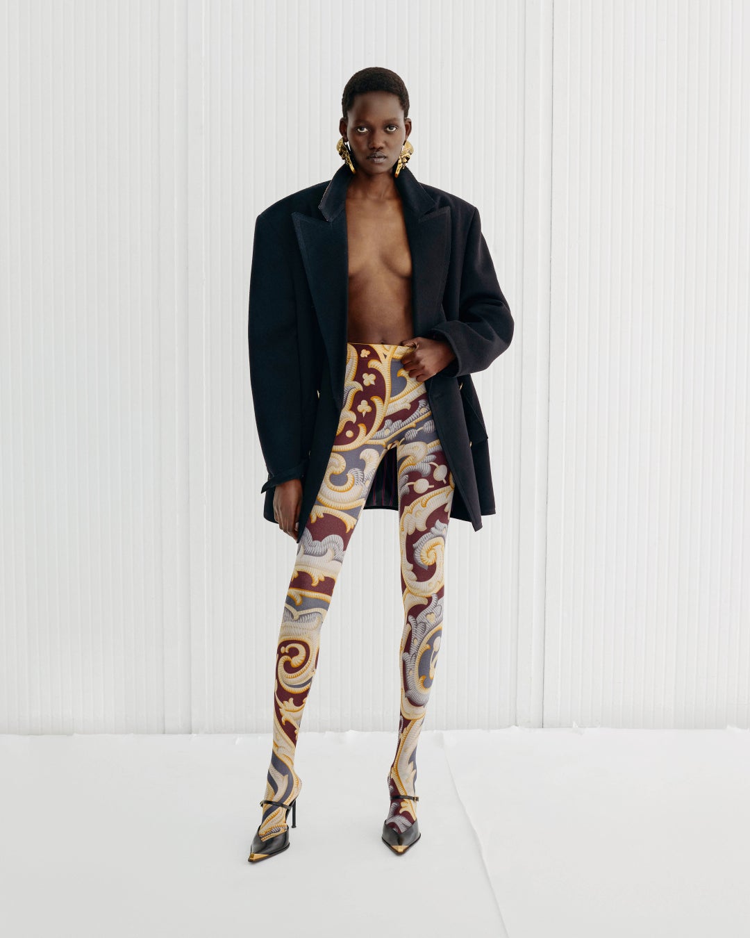 シアーで伸縮性のあるシルエットに新たにデザインされたエトロの特徴的なパターンは、体の曲線に優しくフィットし、動きに応じて滑らかに変化します。ブランドの豊かな歴史を彷彿とさせる独自のモチーフは、繊細な透け感、メタリックなディテールを施したジャカード、光沢のある素材で、ボディスーツ、タイツ、キャットスーツ、トップス、ドレスといったアイテムに表現しています。