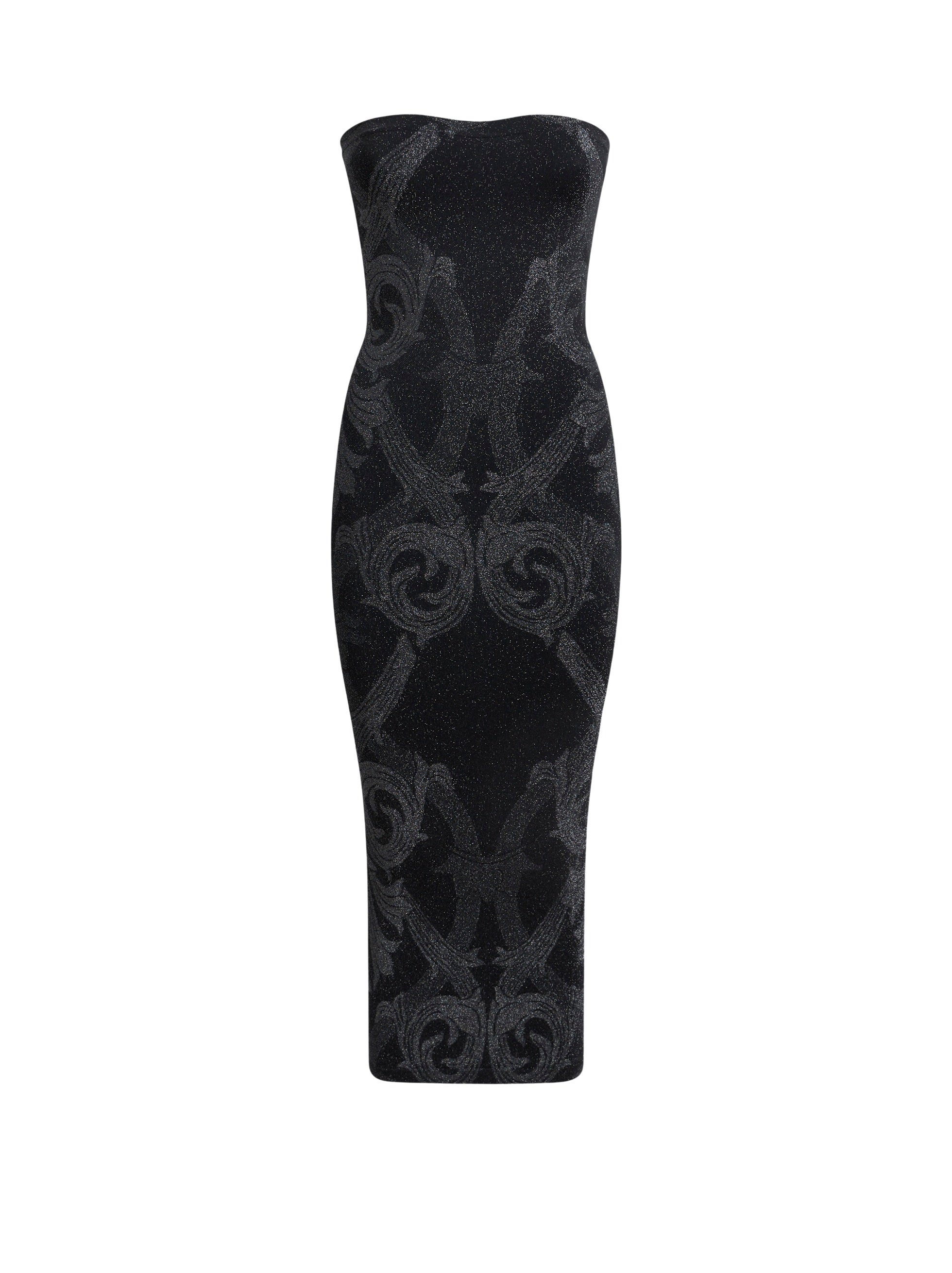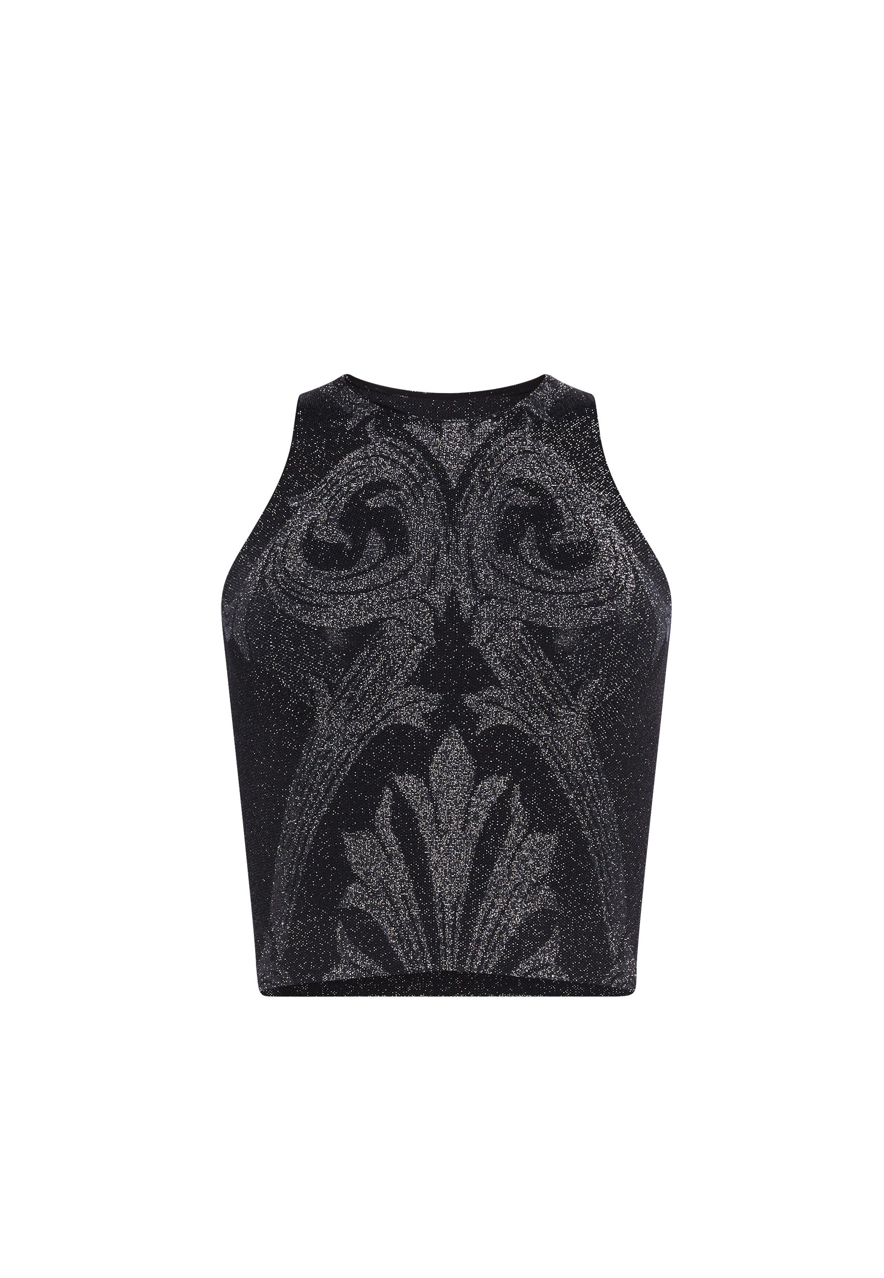 「メタリックジャカード」は、エトロならではの華やかな織物の美しさを、ウォルフォードの卓越した丸編み技術によってトーン・オン・トーンの繊細なニュアンスで表現。銅、銀、金のメタリック糸がブラックのベースに映え、光り輝く効果を生み出し、ドレスや、トップとショートパンツのセットに官能的な透け感を演出します。