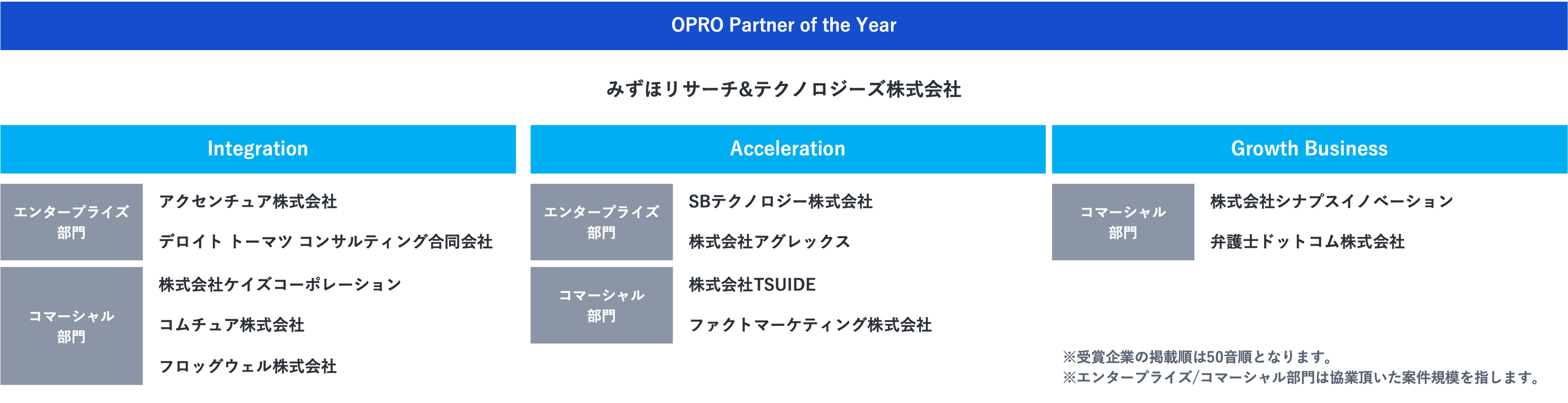 オプロの製品やソリューションを提案・活用し、お客様のビジネス推進にご協力をいただいたパートナー企業様を表彰させていただくアワードです。新規受注数や売上、顧客満足度の向上、新市場の開拓などを指標に、「Growth Business」、「Integration」、「Acceleration」の3部門から、オプロの製品やソリューションを提案・活用いただいたパートナー企業12社を選出いたしました。