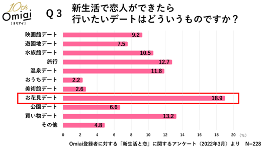 また、「新生活で恋人ができたら、したいデートはどういうものですか?」という問いに対しては、お花見デートが18.9%で、ここでも春ならではの回答が1位となっていました。