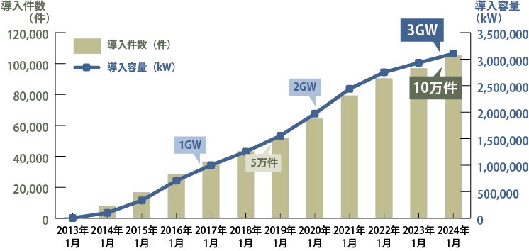 多くのご支持を受け、販売開始から約12年で10万件もの太陽光発電設備へ導入いただくに至りました。