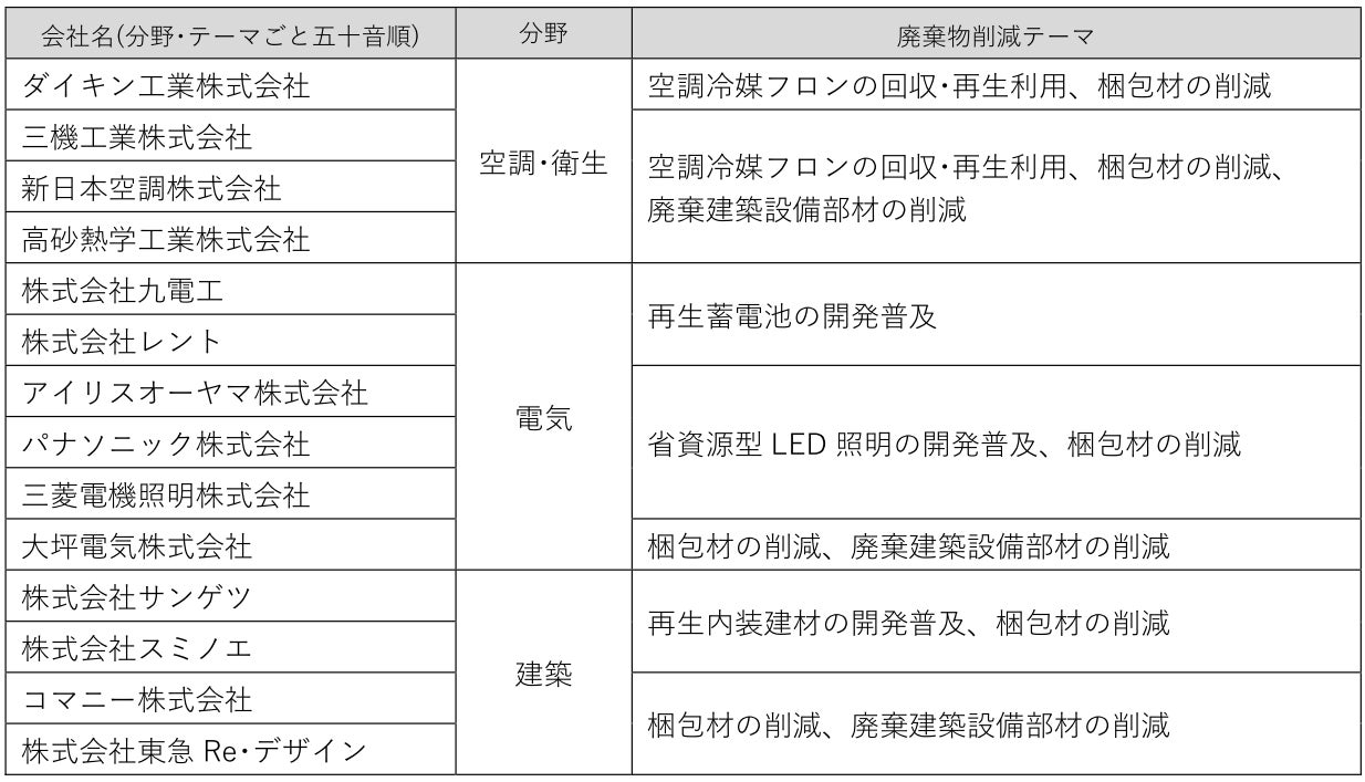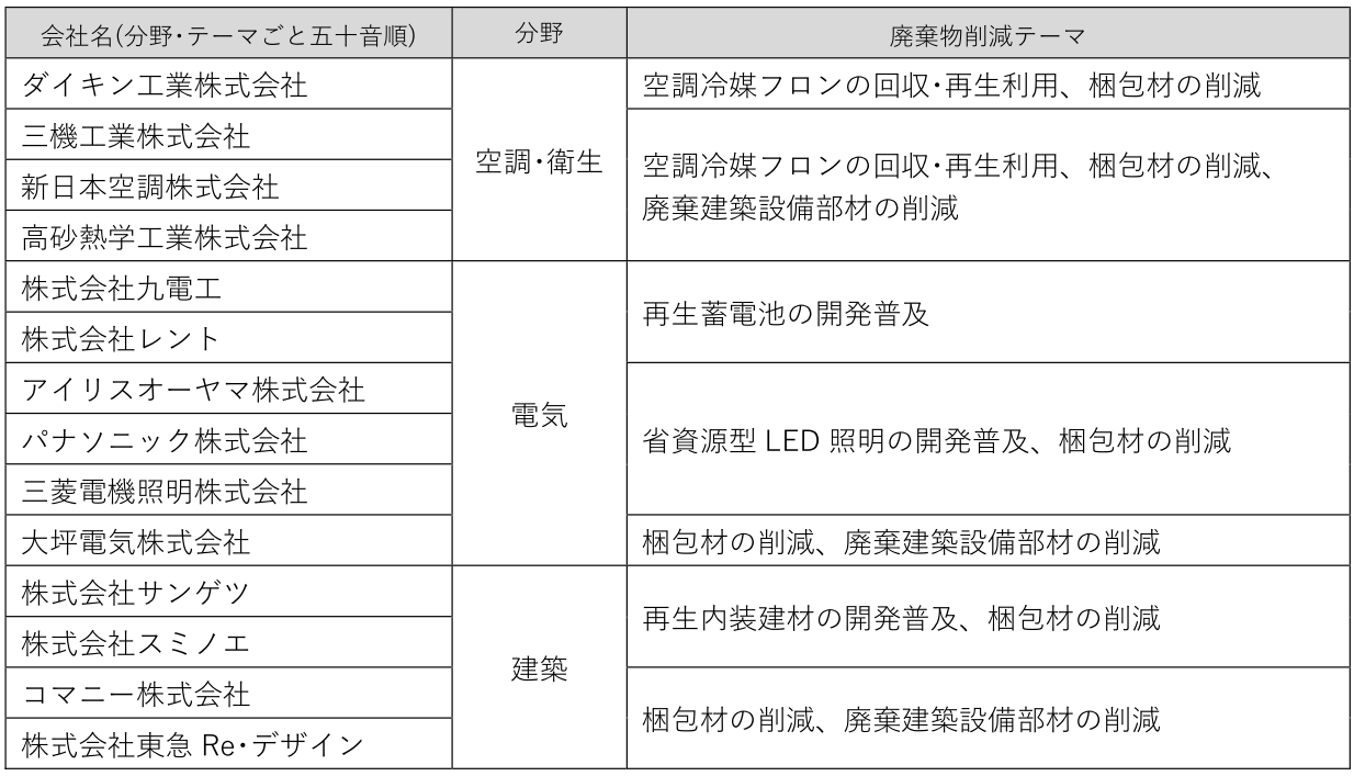 | 主な取り組みテーマ ①空調冷媒フロンの回収・再生利用 ②再生蓄電池の開発普及 ③省資源型LED照明の開発普及 ④再生内装建材の開発普及 ⑤製品梱包材・廃棄建築設備部材の削減 |
