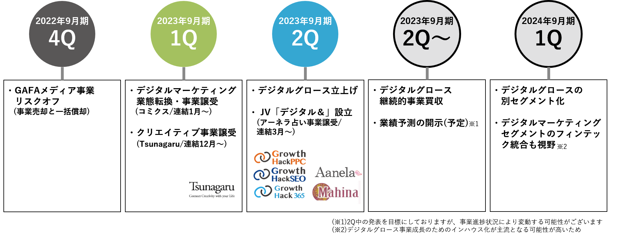 事業買収(M&A及びJV)に対して、フィンテック事業・デジタルマーケティング事業をかけあわせることで、新たなキャッシュフローを生み出すデジタルグロース事業を新設いたします。今後は業績予想の開示を行えるようにすべく、デジタルグロース事業の位置付けに合致するビジネスを業種業態問わずに展開を検討し推進、2024年9月期には、デジタルグロースを第3の収益の柱として、独立したセグメントにする予定でございます。