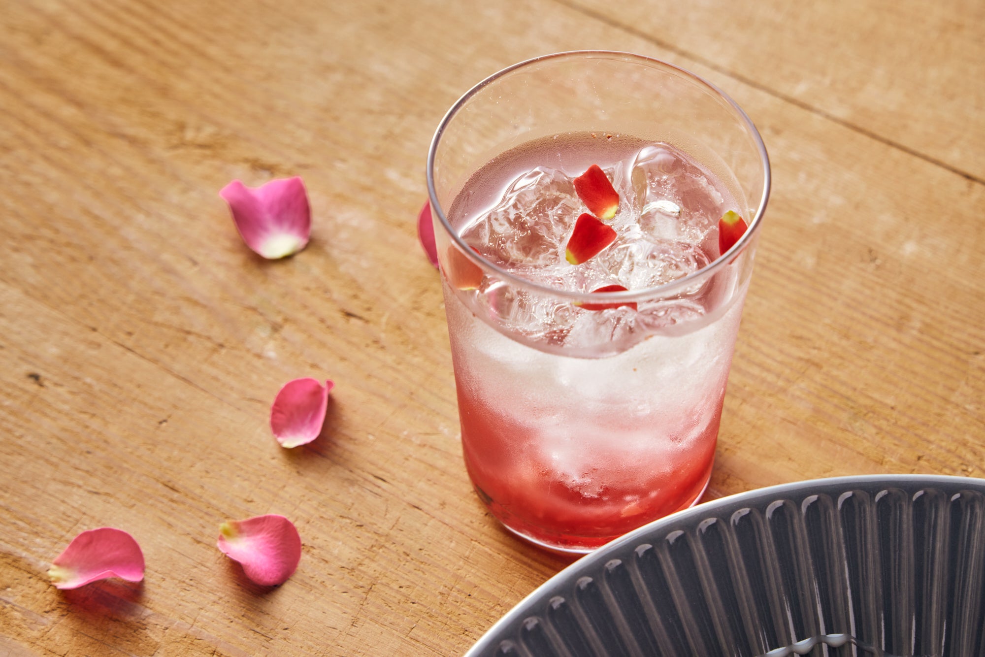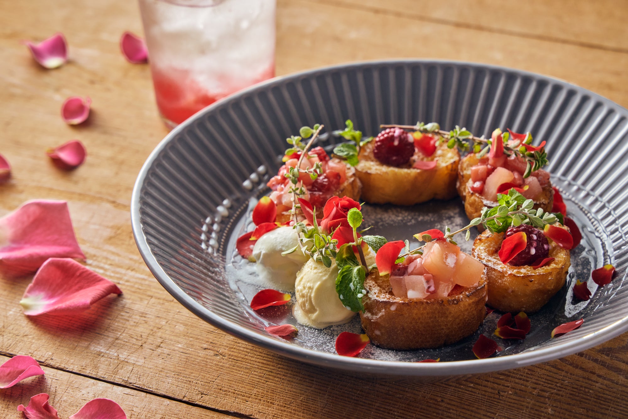 バラをあしらった花かんむりのフレンチトーストとバラと苺のソーダをセットで提供します。