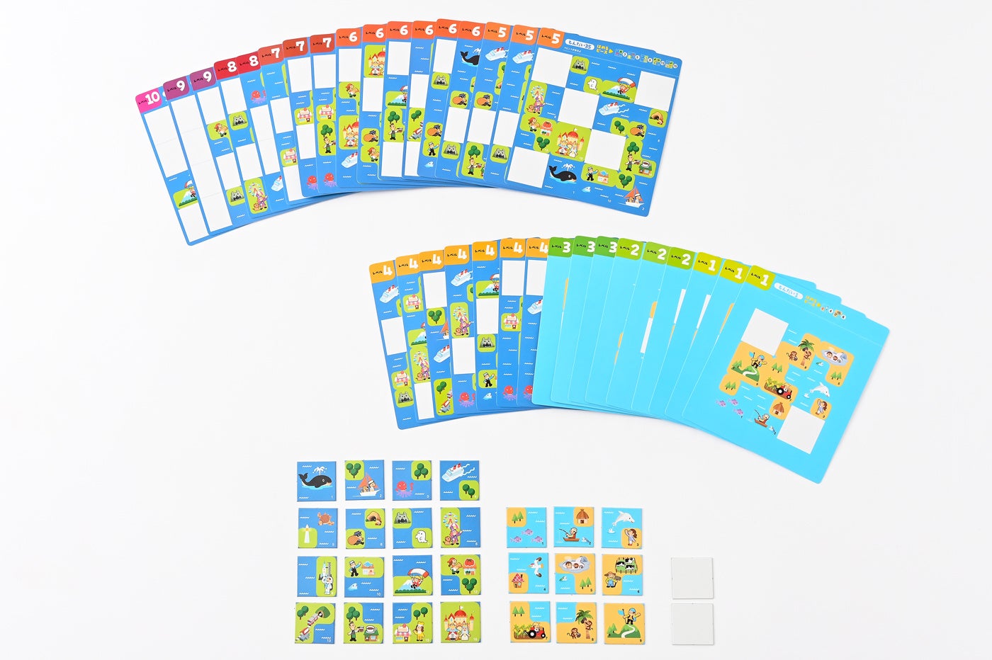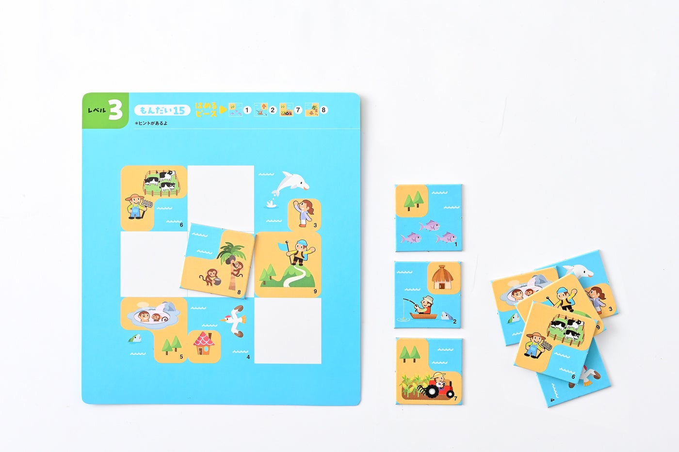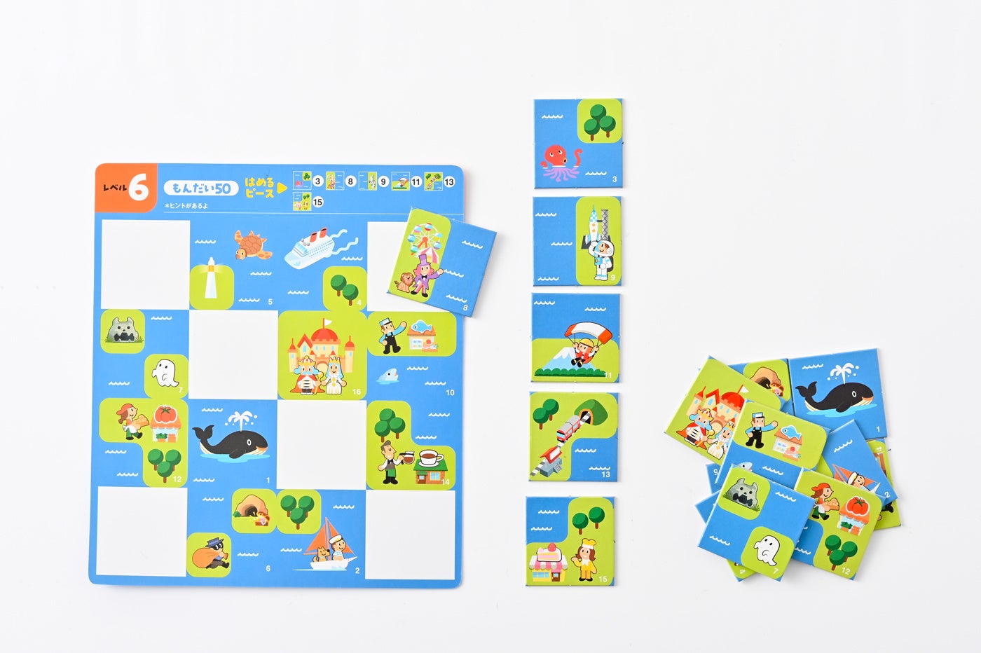 【セット内容】パズルピース 27枚(予備2枚)、もんだいシート35枚(両面使用)、遊び方ガイド、パズルピース収納袋
