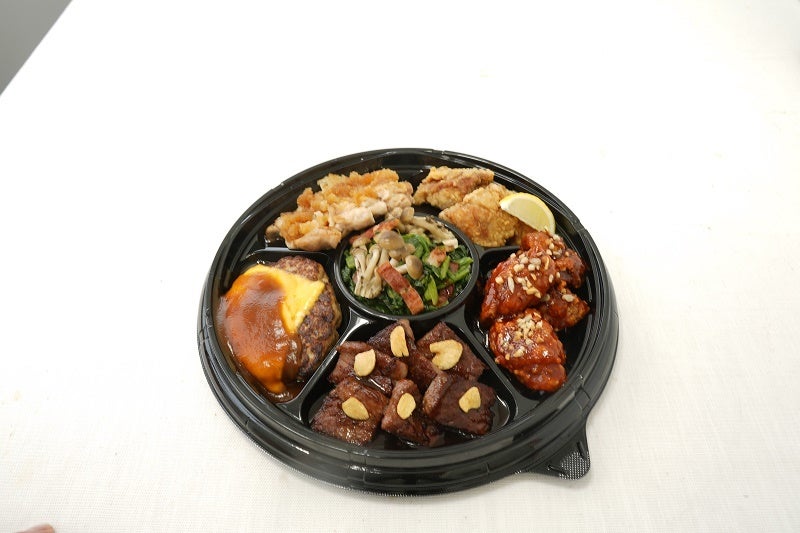 (唐揚げ・ヤンニョムチキン・グリルチキン・デミチーズハンバーグ・牛ロースカットステーキ・ベーコンとほうれん草)