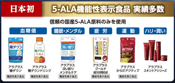 天然多機能アミノ酸「5-ALA」は、生命活動の根源物質とも呼ばれ、細胞内のミトコンドリアにおいてエネルギー産生の根幹を担う重要なアミノ酸で、血糖値、睡眠の質、メンタル、疲労感、運動効率、美肌といった多様な機能を発揮する非常に稀な素材です。しかし、体内の5-ALA生産量は加齢に伴い低下することが知られています。5-ALAは、発酵食品や緑黄色野菜、肉・魚等の食品にも含まれますが、その量はごく微量で食品だけで補うのは難しい成分です。