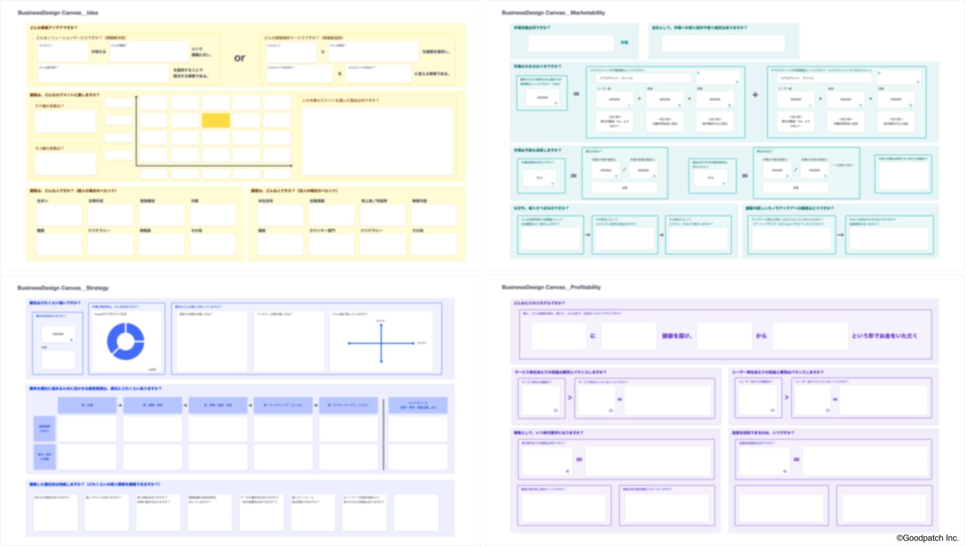 「BusinessDesign Review」は、事業が成立するために必要な要素を元に、グッドパッチが設計した4つの独自のフレームワークを活用しながら顧客と対話をし、事業案の成立性について検証・改善するサービスです。