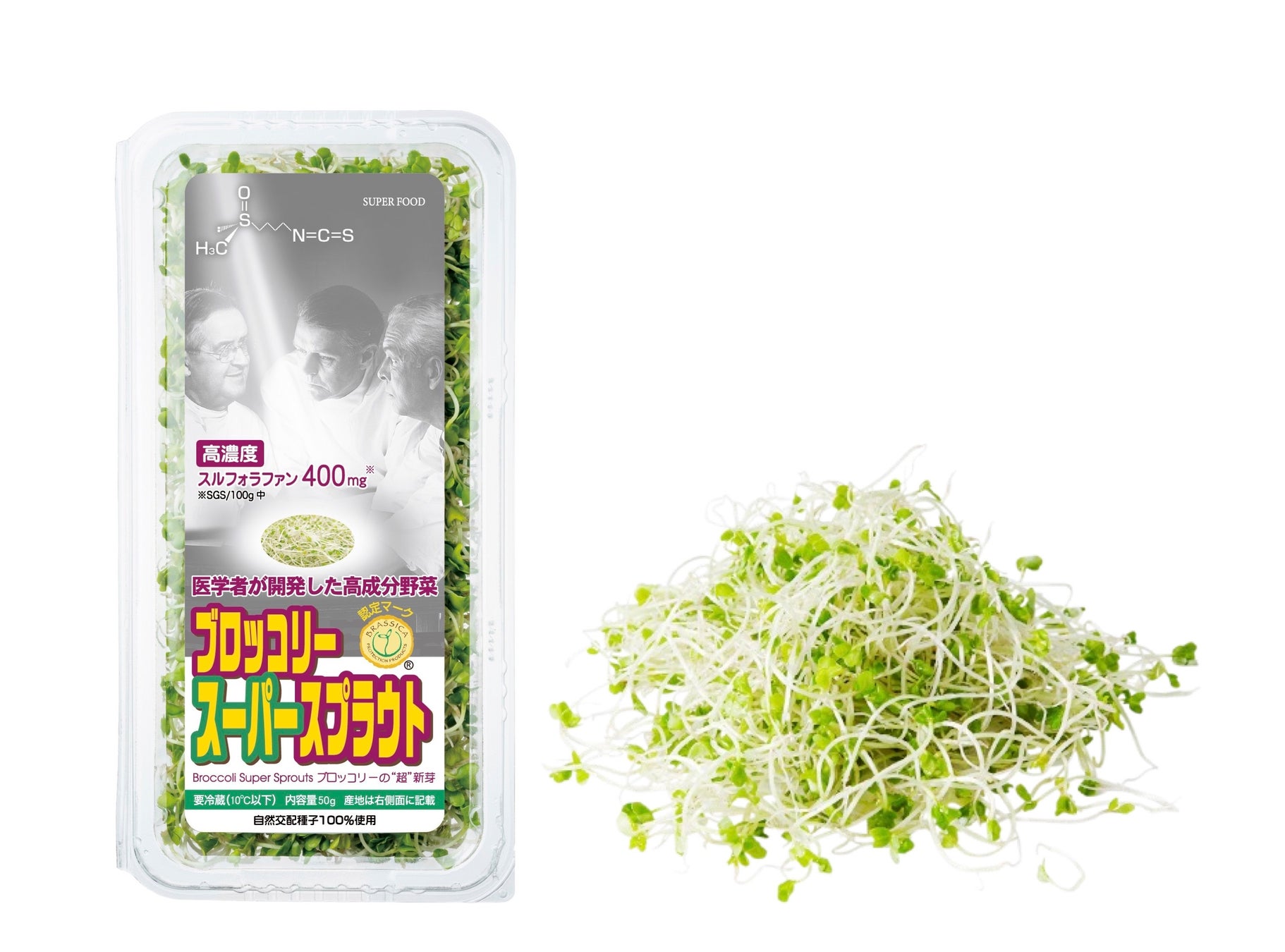 米国ジョンズ・ホプキンス大学医学部のポール・タラレー博士が開発した高濃度スルフォラファンのブロッコリースプラウトを、日本国内における独占ライセンス契約を結んだ当社だけが生産・販売しています。以下2タイプから、形や食感、料理の用途など、お好みに合わせてお選びいただけます。