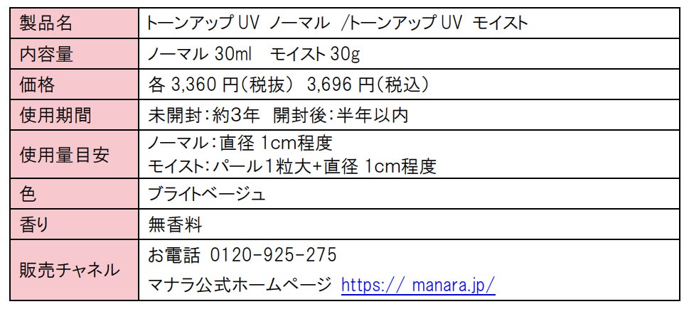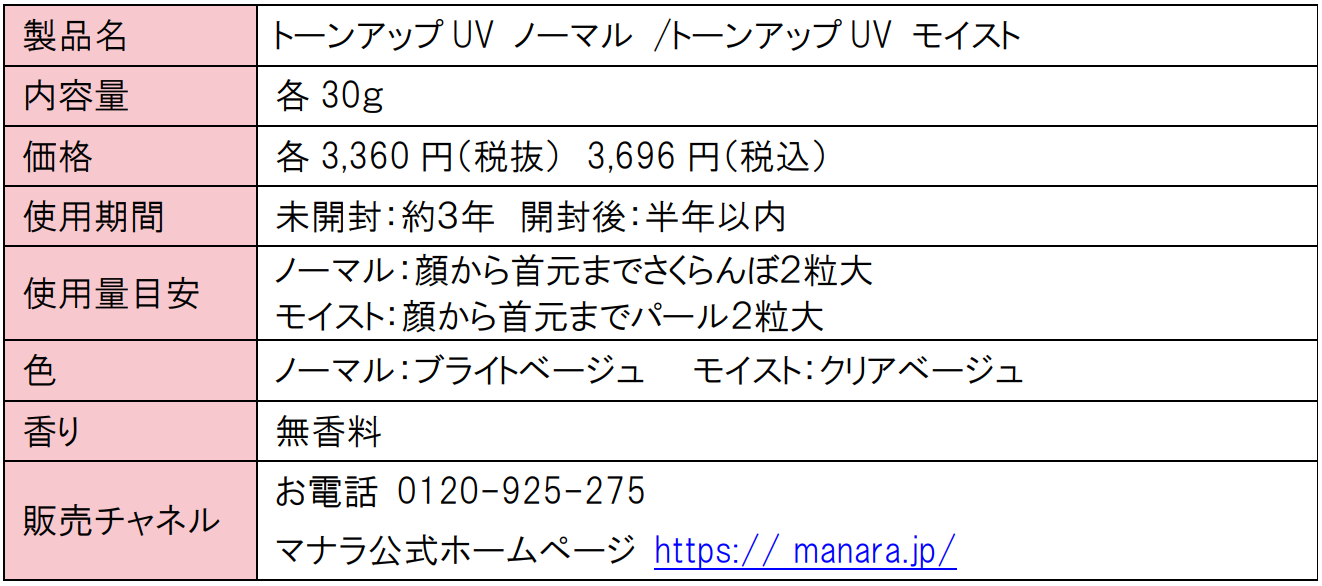 マナラ 〈トーンアップ UV〉は、肌を紫外線からしっかりと守りたいと感じている方や、マスク生活が続く中、軽めのベー スメイクを好まれる方、マスクへのファンデーションの色移りや気になる方などに使っていただきたい、新・日やけ止め ミルクです。最先端の光カット機能を搭載し、紫外線(UVA・UVB)はもちろん、肌の奥深くへ入り込む有害なディープ 太陽光(近赤外線・ブルーライト)もしっかりカットします。また、年齢を重ねることでトーンダウンしがちな大人の肌を ワントーン明るく、ツヤめく白肌へと仕上げます。 普通肌~乾燥肌の方向けのマナラ〈トーンアップ UV ノーマル〉と、超乾燥肌の方向けのマナラ〈トーンアップ UV モイスト〉の2種が登場。トーンアップ UV ノーマルは、特に春夏など肌のベタつきが気になる季節にサラッとした感触 に仕上げたい方に。トーンアップ UV モイストは、特に秋冬の肌の乾燥する季節にしっとりとした感触に仕上げたい方 におすすめです。