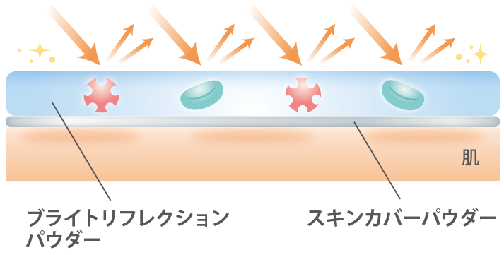 スキンカバーパウダー配合により※1、気になる肌の色ム ラやくすみをしっかりカバー。その上を覆うブライトリフレ クションパウダー※2 が、自然光を乱反射させることで、 ワントーン明るい肌へと仕上げます。