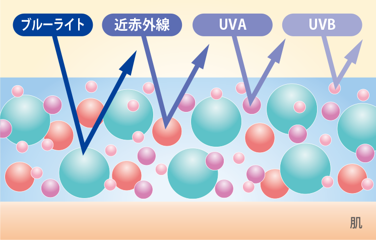 「SPF50+ PA++++」で、UVA、UVB は最高レベルのカット力を発揮。加えて、 近年肌老化の大きな原因といわれており、肌の奥深くまで入り込んでシワの 原因になるといわれるディーブ UV(近赤外線・ブルーライト)もしっかりカット します。 また、4 種類の大きさの違う粉体で、最先端の光カットを備えていながら、 ノンケミ処方で肌への優しさも同時に実現しました。