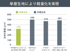 単層素材(320g/m²未満)を中核とした3層ラミネート構成で軽量化と快適性を両立