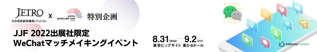 宝飾業界のプロが集まる国際ジュエリートレードショー「JJF2022」は8月31日~9月2日の3日間、東京ビッグサイト東館にて開催!来場登録はこちらから:https://www.informa-japan.com/jjf/form/visitor_regist.php