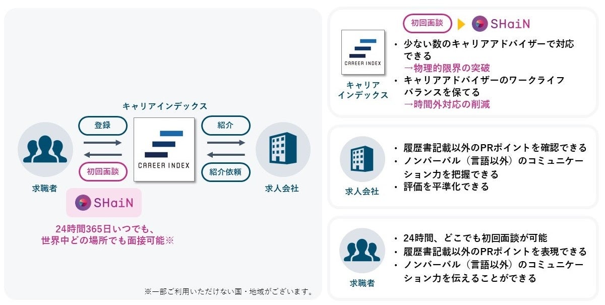 現在「CAREER INDEX」には、月あたり数万人の会員登録があり、その中の初期面談希望者に対してCAが連絡を取り面談を実施しておりますが、このプロセスにSHaiNを導入することにより、SHaiNの開発コンセプトの一つである「24時間365日いつでも、世界中どの場所でも面接可能※」の利点が最大限に生かされ、求職者が好きな時間に、好きな場所で面談を実施できるようになります。