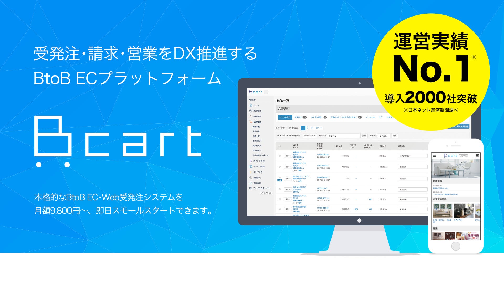 『Bカート』( https://bcart.jp/ )は、運営実績No.1(※日本ネット経済新聞社調べ)の、受発注・請求・営業をDX推進するBtoB ECプラットフォームとして、導入実績2000社超、延べ75万社超の法人及び事業者間の取引にご利用いただいております。本格的なBtoB EC・受発注DXが、月額9,800円~、即日でスモールスタートできるサービスです。