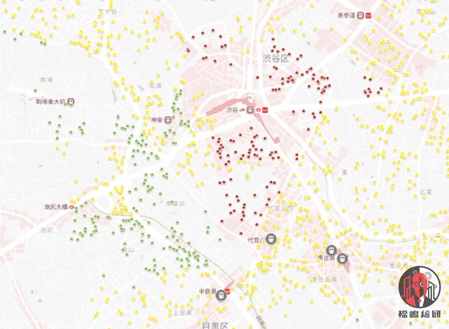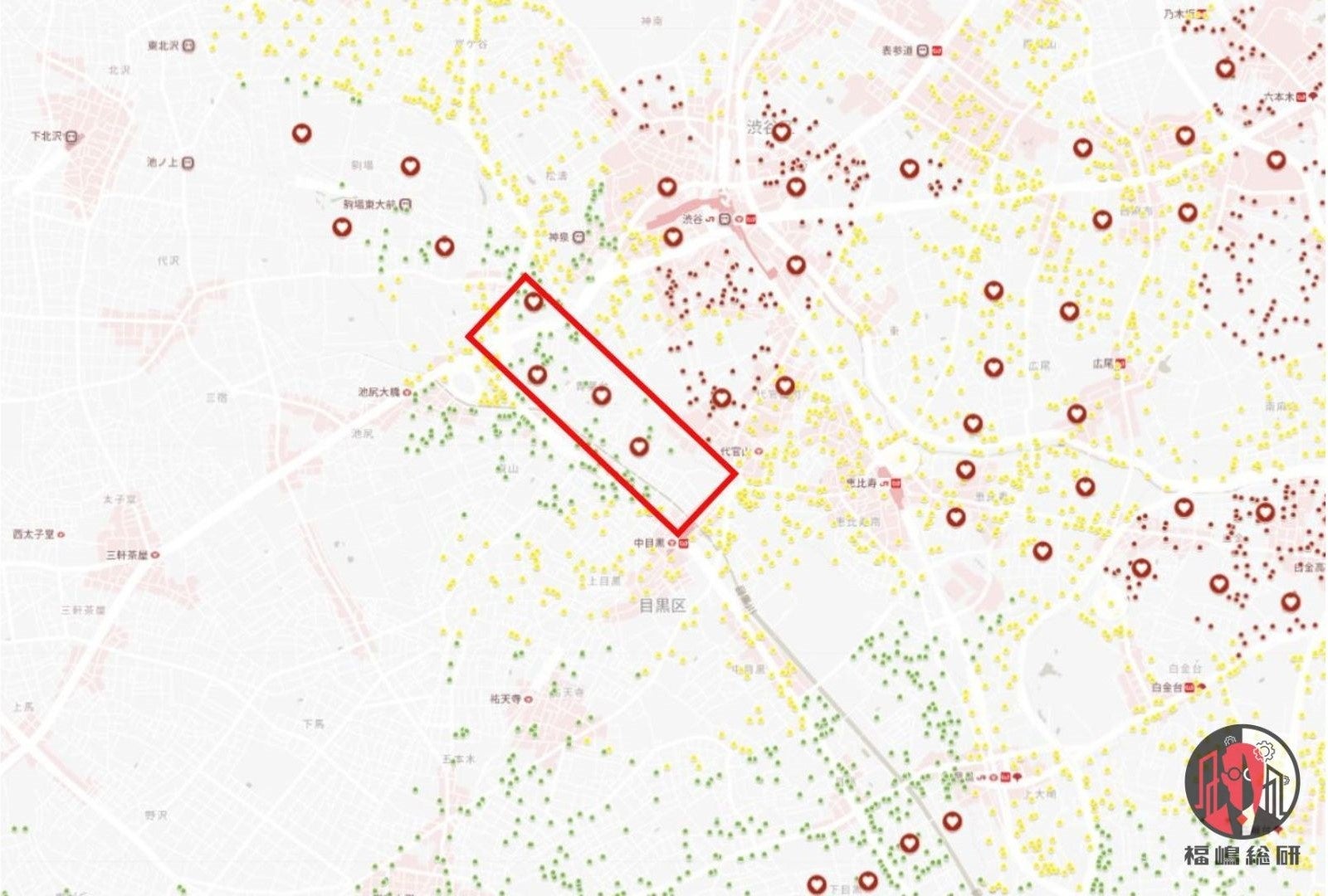 図4では、青葉台の最寄り駅の一つである代官山駅周辺の詳細な状況が示されています。この図によると、青葉台に隣接するエリアでは、既に坪単価800万円を超える水準となっており、高価格帯エリアとしての地位を確立しています。それに対して青葉台の価格は依然として抑えられているものの、街並みや生活環境は周辺とほぼ同等であり、整った都市景観と文化的な雰囲気が共通しています。