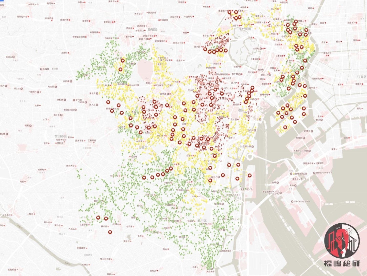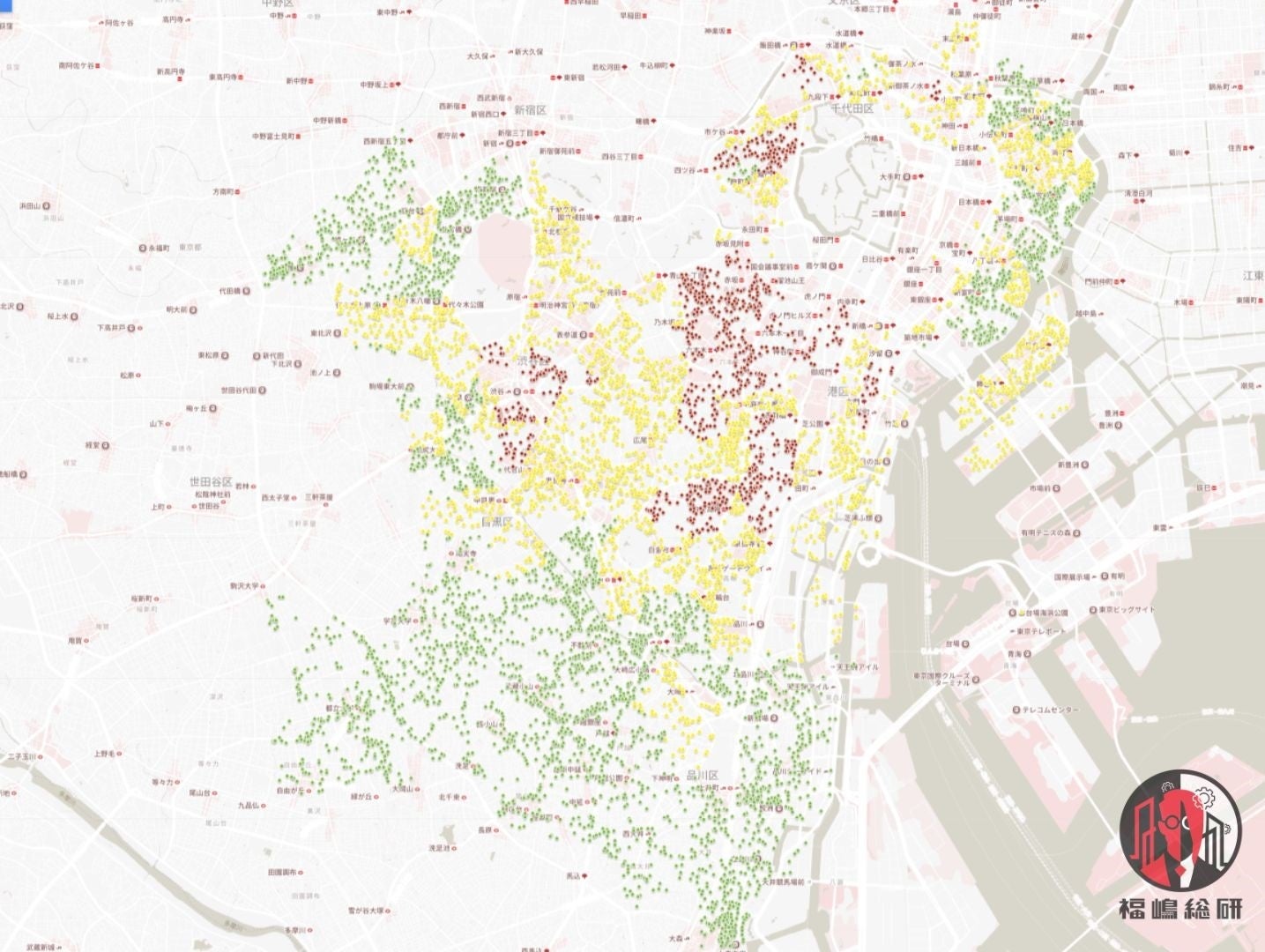 このプロットによって、高額物件が集中するエリアと、比較的価格が抑えられているエリアとが明確に区別され、都心部における不動産市場の構造的な特徴が浮かび上がります。