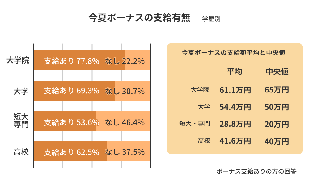 また最終学歴別に今夏ボーナスの”支給有無”を見ていくと、”支給あり”の最多回答は「大学院卒」で77.8%、次いで「大学卒」が69.3%、「高校卒」が62.5%の回答結果になり、支給ありの回答が最も低かったのは「短大・専門卒」で53.6%でした。