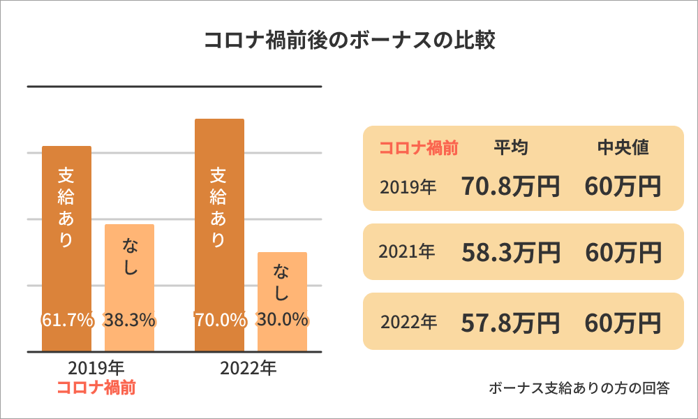 また”支給額”について見ていくと2019年夏のボーナス平均支給額は「70.8万円」に対して、今夏(2022年)ボーナスの平均支給額は57.8万円になりました。