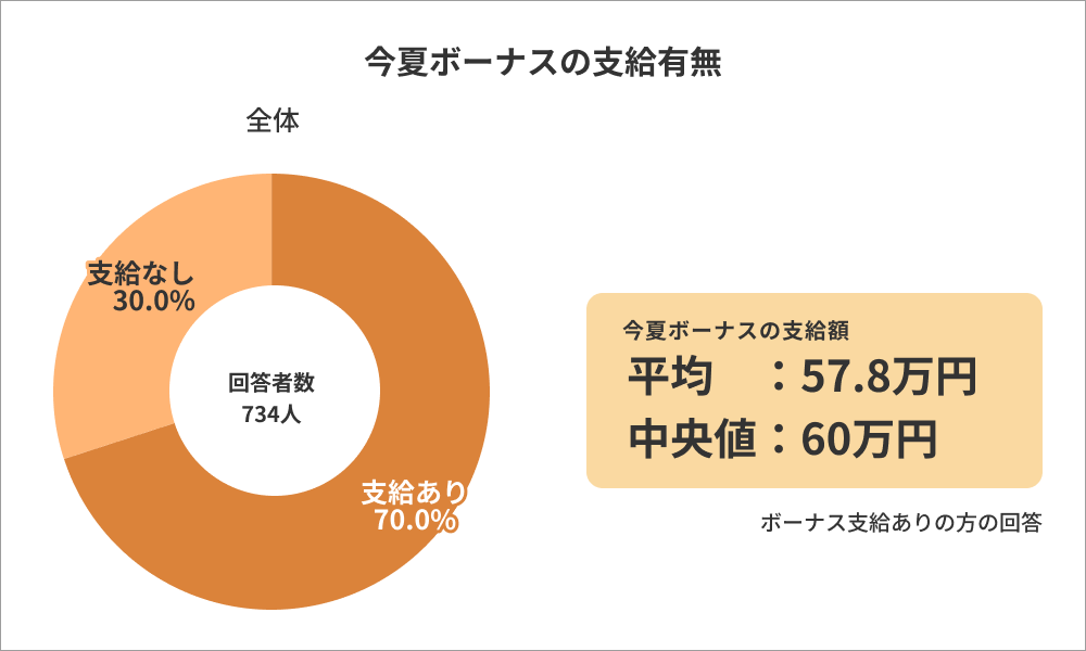 今夏ボーナスの支給有無について、全体の70.0%が「支給あり」と回答し、その支給額の平均は57.8万円で中央値は60万円という結果になりました。