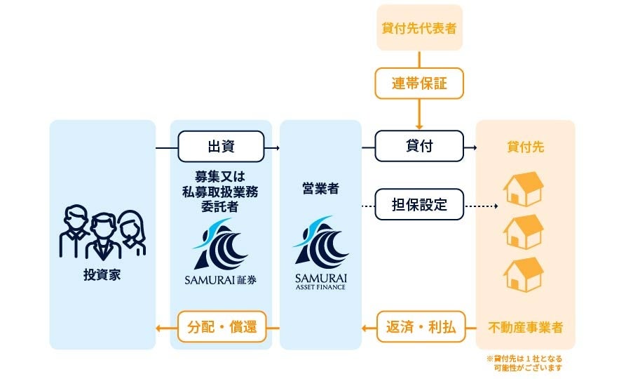 このファンドは、SAMURAI ASSET FINANCE株式会社(以下、「営業者」といいます。)が不動産事業者(以下、「本貸付先」といいます。)に対して貸し付け(以下、「本件貸付」といいます。)する貸付型クラウドファンディングとなります。