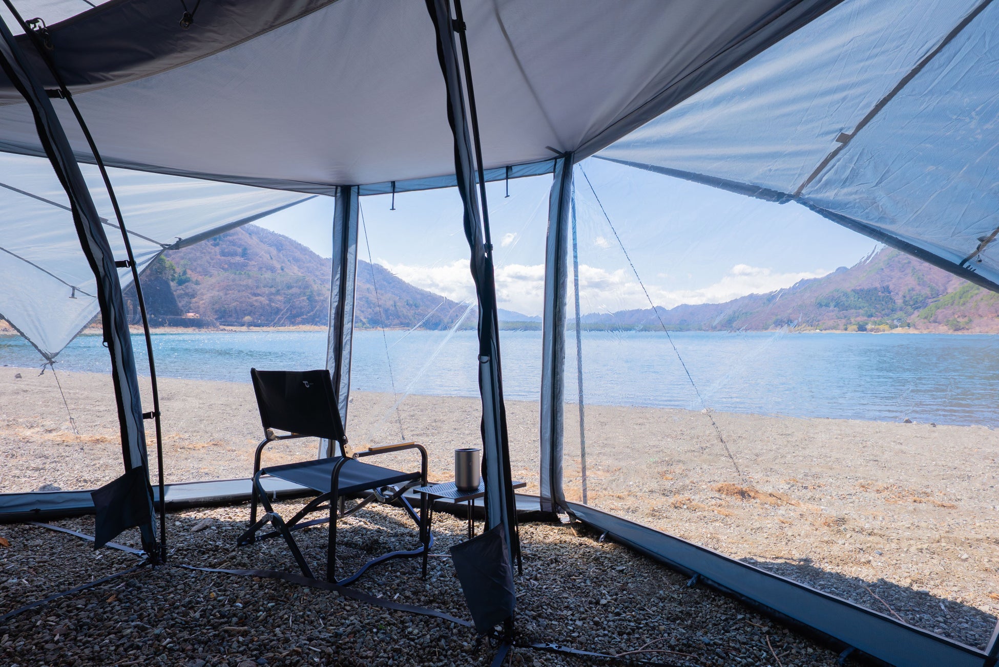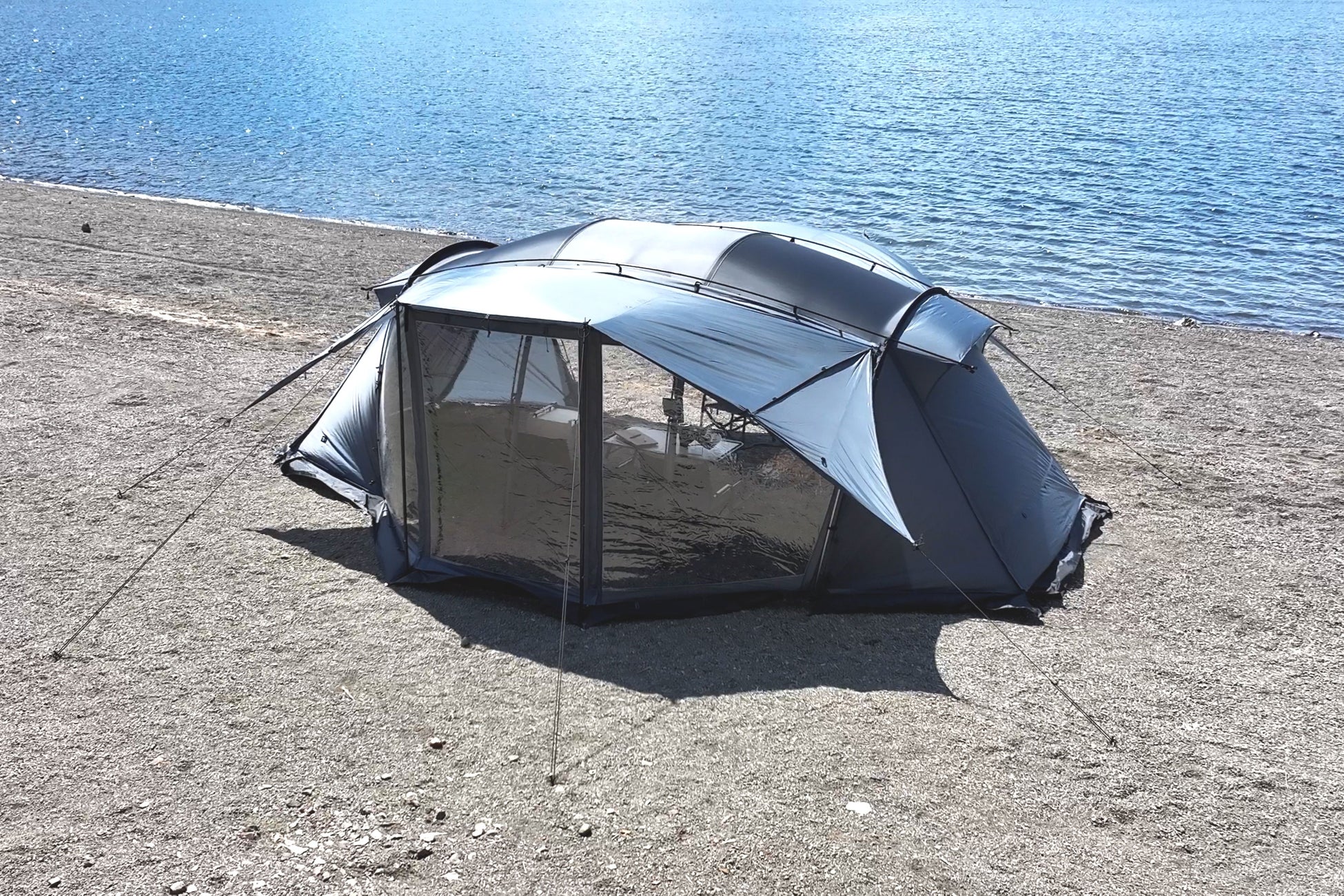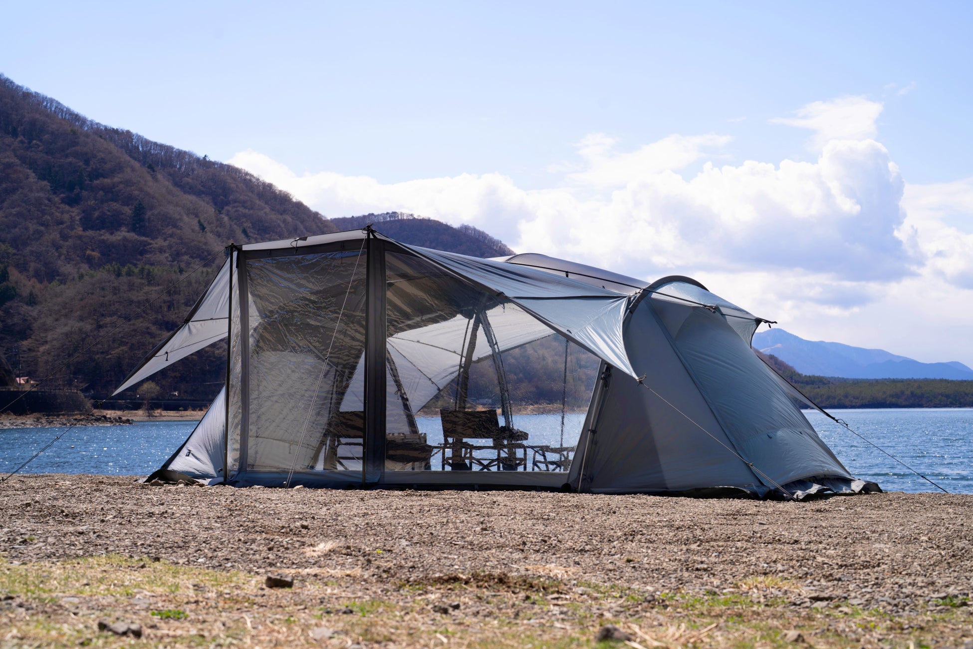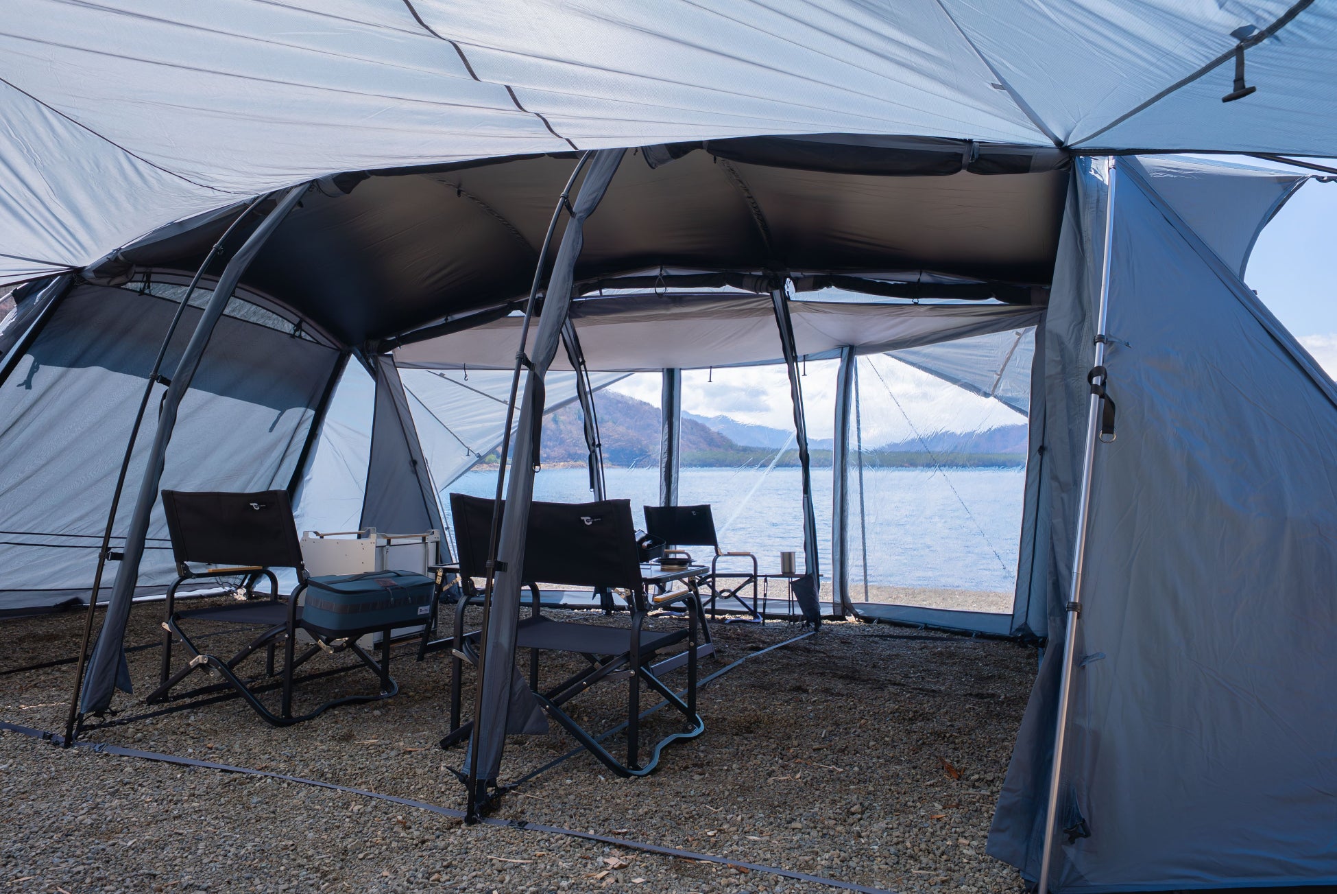 テント内の有効スペースが跳ね上げ部分まで広がるので、居住空間が格段に広がります。大型のテーブルやチェアを室内に設置しても広いスペースを確保し、移動もスムーズです。気温や天候に合わせて開放感と快適性を自在にコントロールできる、自由度の高いキャンプスタイルを実現できます。メインパネルを開放したまま、アウターパネル下まで有効スペースを活用できるため、テント内の”おこもり空間”を従来以上にゆったり確保。外の景色を楽しみながら、家族や仲間との今までにないくつろぎのひとときを過ごすことができます。