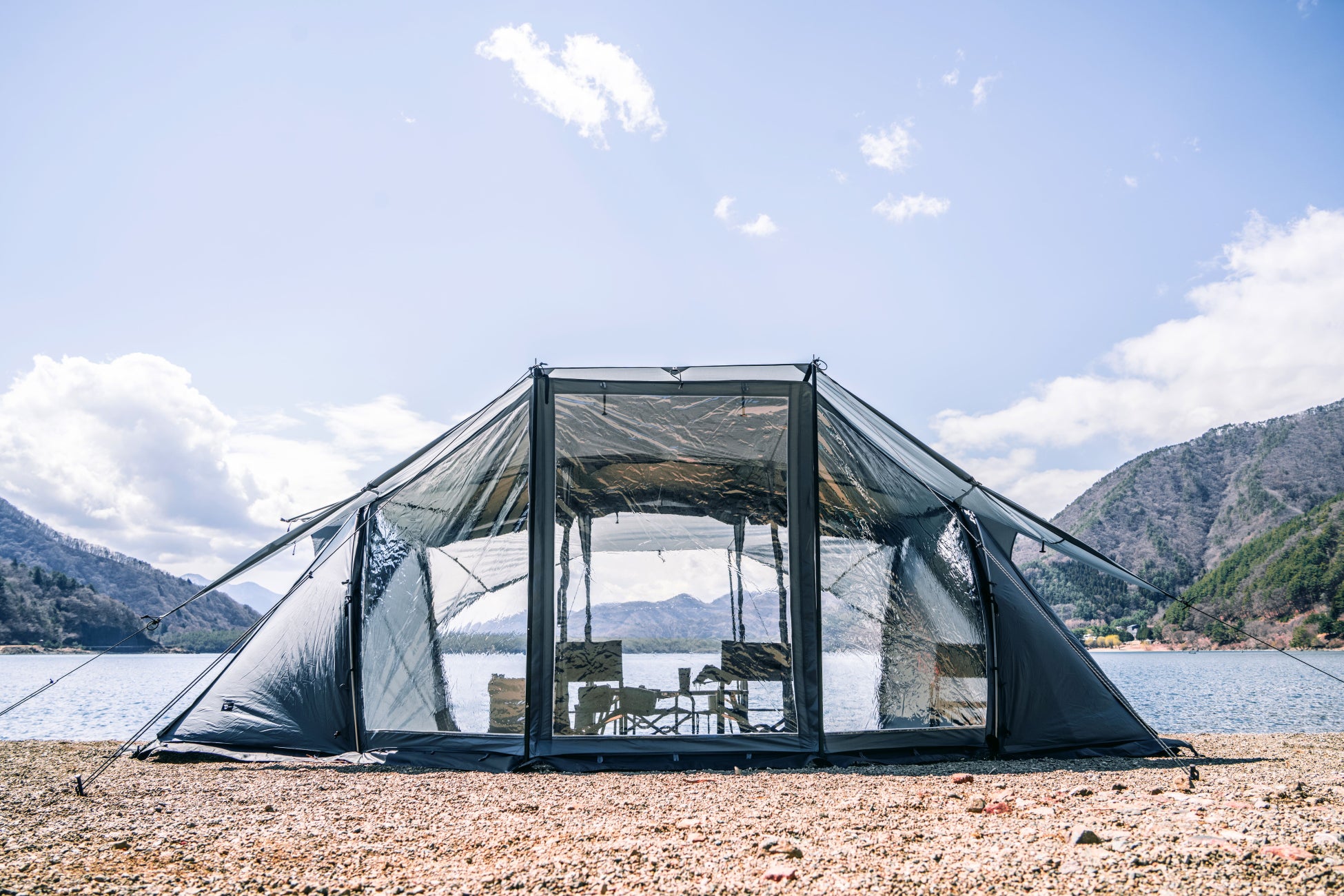 「寒いシーズンでのキャンプや風の強いシチュエーションでも、テントの中から雄大な景色を思う存分堪能したい」そんなリクエストに応えるため、ウィングフォートで使用できる大画面のTPUウィンドウを開発しました。広い視界をキープしたまま室内空間を広げるために、アウターパネルを跳ね上げた状態で設置する構造を採用。3面のパノラマデザインは、アウターパネル全体を覆うように設置できる大型ウィンドウで、自然光をたっぷり取り込み雄大な景色を室内から一望することが可能で、ラグジュアリーな空間を演出してくれます。