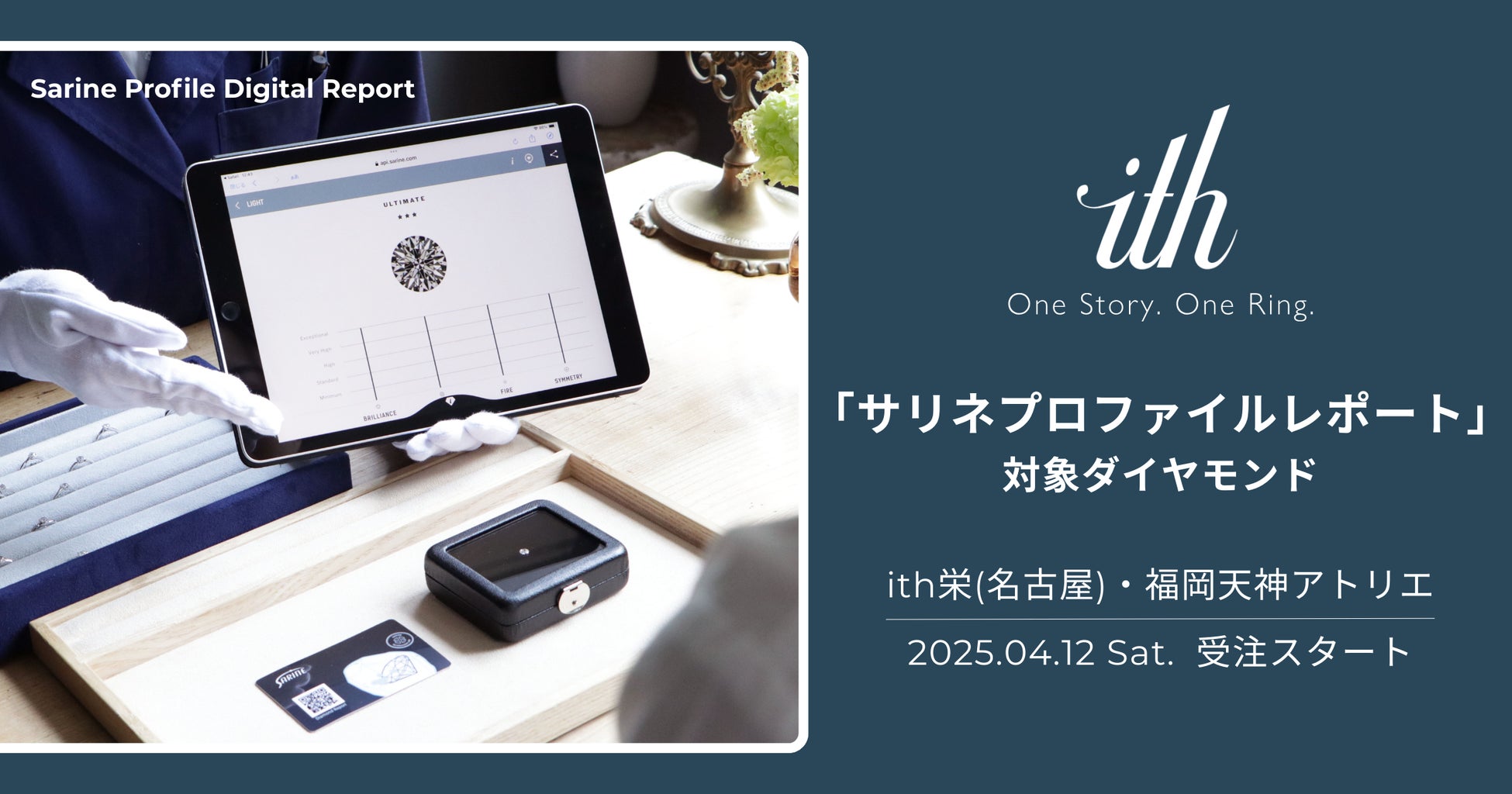 ithは、“One Story.One Ring.” をコンセプトにしたオーダーメード結婚指輪ブランドです。イスラエルに本社を置くサリネ・テクノロジー社 (Sarine Technologies Ltd. Israel) が提供する、ダイヤモンドの輝きを分析評価する「サリネプロファイルレポート」付きダイヤモンドについて、昨年導入済みの銀座アトリエに続き、2025年4月12日(土)より名古屋の「ith栄アトリエ」および「ith福岡天神アトリエ」にて取り扱いを開始いたします。