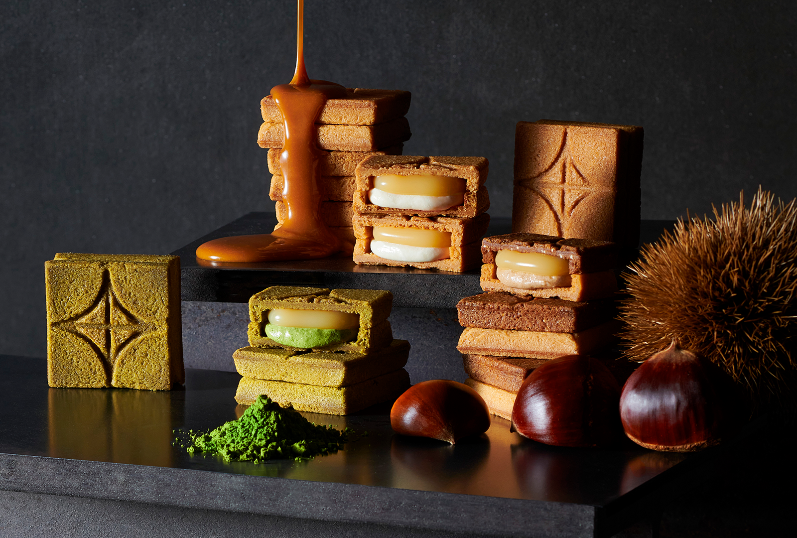 2層仕立ての定番「バターサンド」、栗バタークリームにイタリア産の栗から作ったマロングラッセを加え濃厚な栗の風味に仕上げた「バターサンド〈栗〉」、コクのあるバターとの相性を考え、すっきりとした苦味と、香りの良い宇治抹茶を使った緑鮮やかな「バターサンド〈宇治抹茶〉」の詰合せ。それぞれ異なる風味の奥深さをお楽しみいただけます。