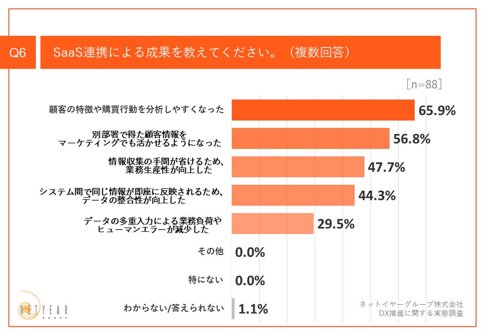 Q5で「できている」「ややできている」と回答した方に、「Q6.SaaS間のAPI連携による成果を教えてください。(複数回答)」(n=88)と質問したところ、「顧客の特徴や購買行動を分析しやすくなった」が65.9%、「別部署で得た顧客情報をマーケティングでも活かせるようになった」が56.8%、「情報収集の手間が省けるため、業務生産性が向上した」が47.7%という回答となりました。