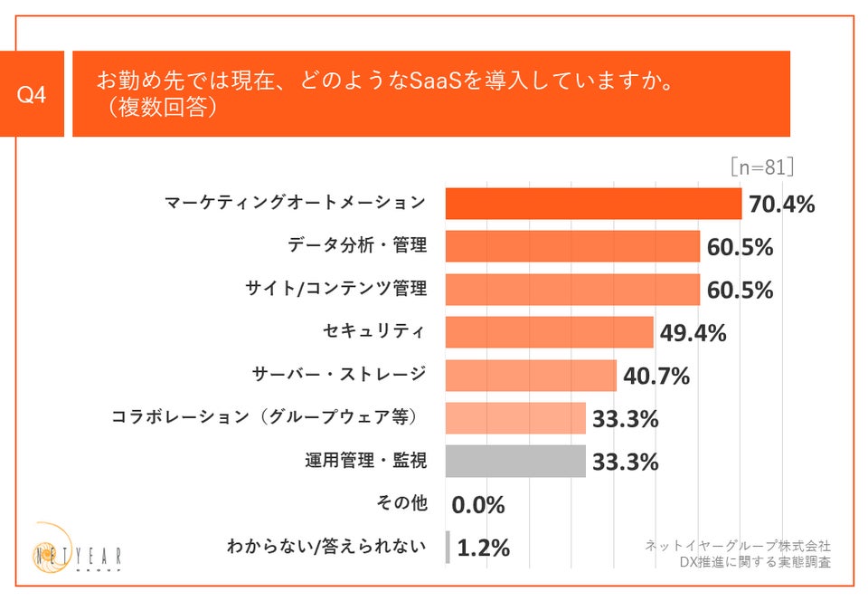 Q1で「攻めのDX」「どちらにも注力している」と回答した方に、「Q4.お勤め先では現在、どのようなSaaSツールを導入していますか。(複数回答)」(n=81)と質問したところ、「マーケティングオートメーション」が70.4%、「データ分析・管理」が60.5%、「サイト/コンテンツ管理」が60.5%という回答となりました。
