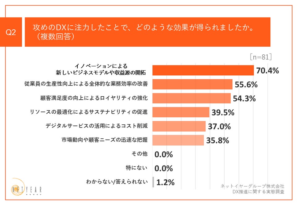 Q1で「攻めのDX」「どちらにも注力している」と回答した方に、「Q2.攻めのDXに注力したことで、どのような効果が得られましたか。(複数回答)」(n=81)と質問したところ、「イノベーションによる新しいビジネスモデルや収益源の開拓」が70.4%、「従業員の生産性向上による全体的な業務効率の改善」が55.6%、「顧客満足度の向上によるロイヤリティの強化」が54.3%という回答となりました。