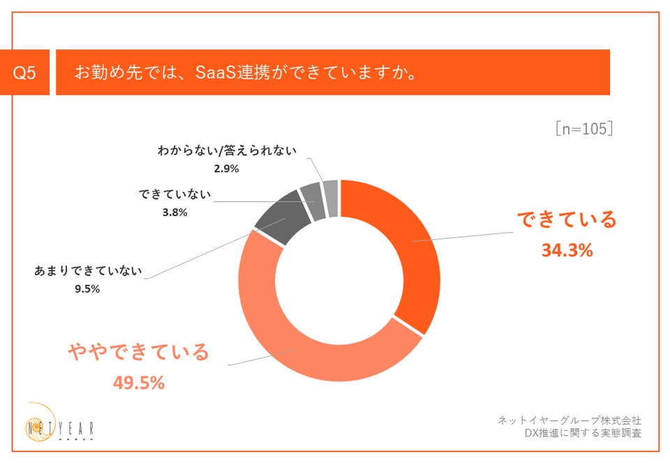 「Q5.お勤め先では、SaaS間のAPI連携ができていますか。」(n=105)と質問したところ、「できている」が34.3%、「ややできている」が49.5%という回答となりました。