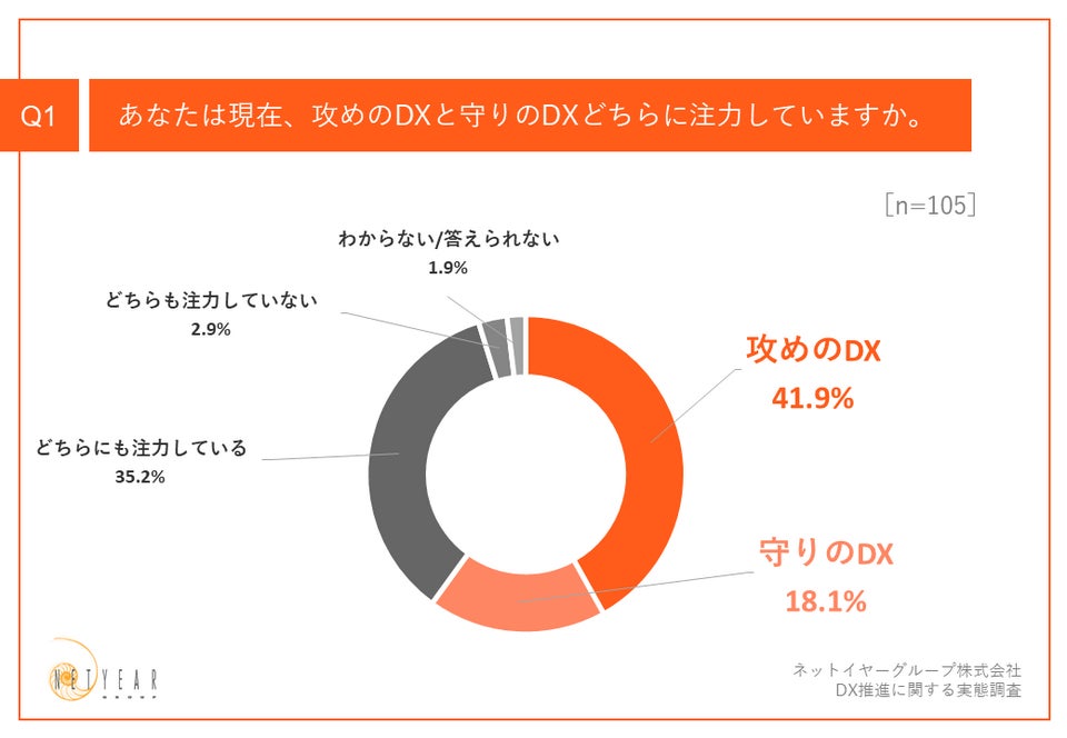 「Q1.あなたは現在、攻めのDXと守りのDXどちらに注力していますか。」(n=105)と質問したところ、「攻めのDX」が41.9%、「守りのDX」が18.1%という回答となりました。