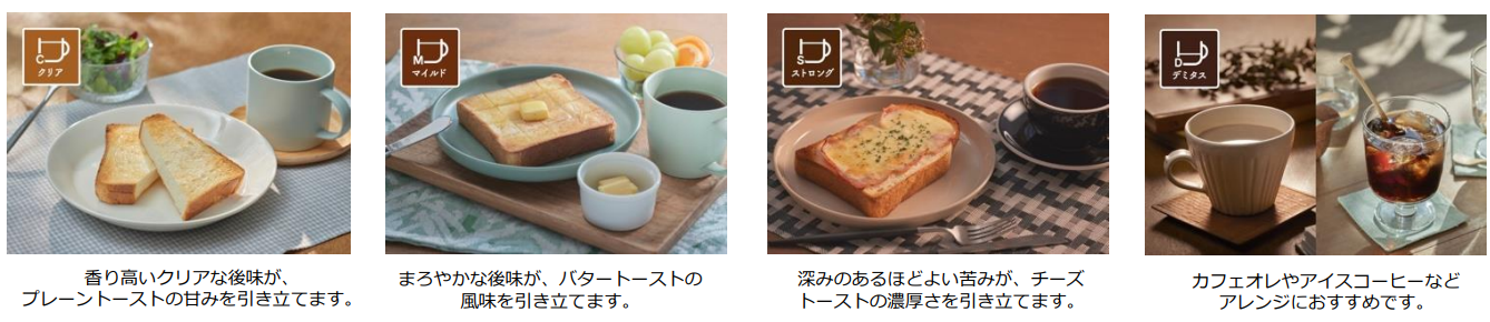 軽やかな味わいから深みのある味わいまで、4つのテイストを選ぶことができます。一緒に食べるトーストに合わせて、コーヒーを楽しむシーンに合わせて、お好みの味わいをお楽しみいただけます。