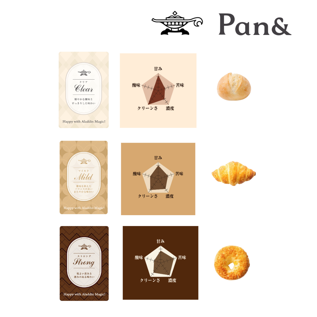 ポップアップストア「アラジンコーヒースタンド」では、コーヒー本来の旨味を抽出し、雑味を抑えるアラジン独自の方式「バイパスドリップ※」で抽出した淹れたてのコーヒーを、3種類のテイストの中からお好きなテイストを選んで無料で試飲いただけます。コーヒー豆は、国際コーヒー鑑定士の資格をもつコーヒー焙煎士がいるコーヒー豆専門店「珈琲きゃろっと」が、アラジンのためにパンに合うように特別に配合した「アラジンブレンド」を使用。コーヒーと一緒にそれぞれのテイストに合う冷凍パンブランドとして人気の「Pan&(パンド)」の極上のプティパンもご用意しており、パンとコーヒーのマリアージュをご提案いたします。