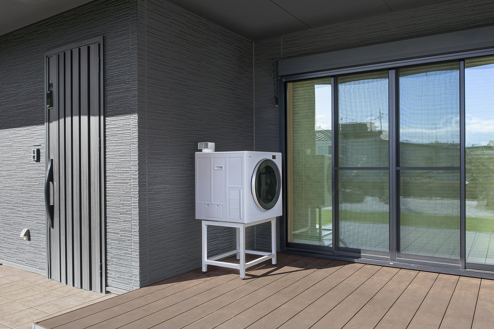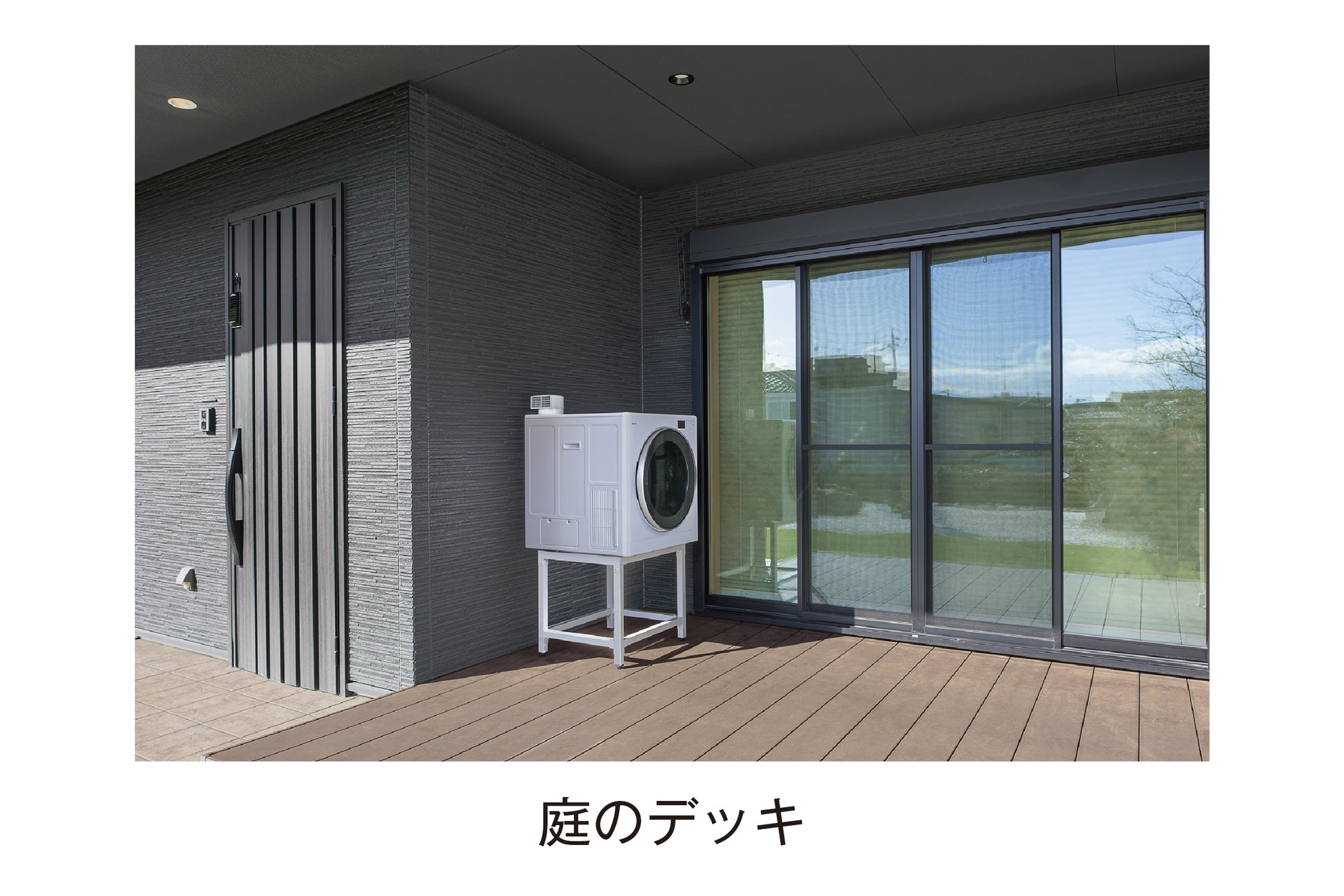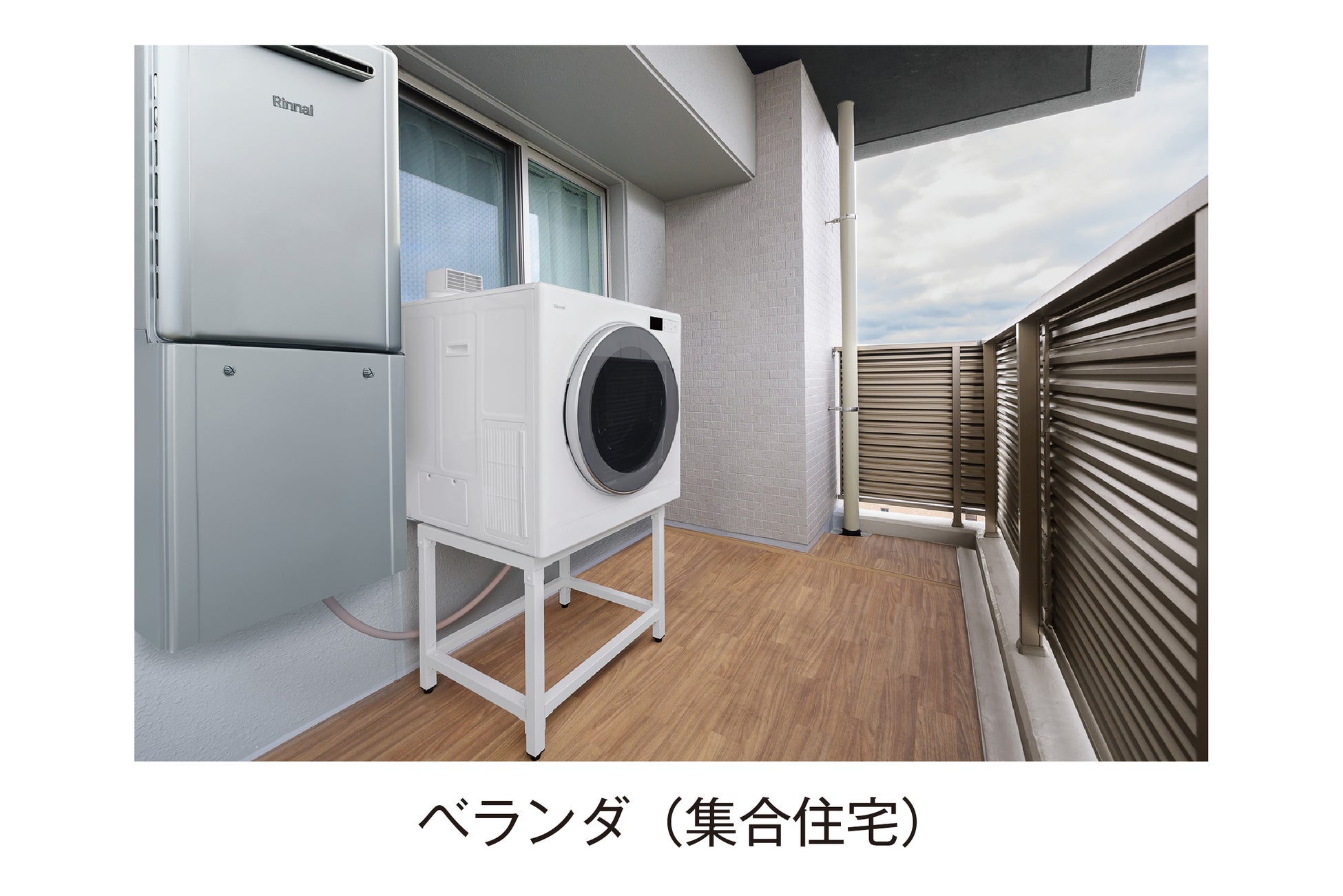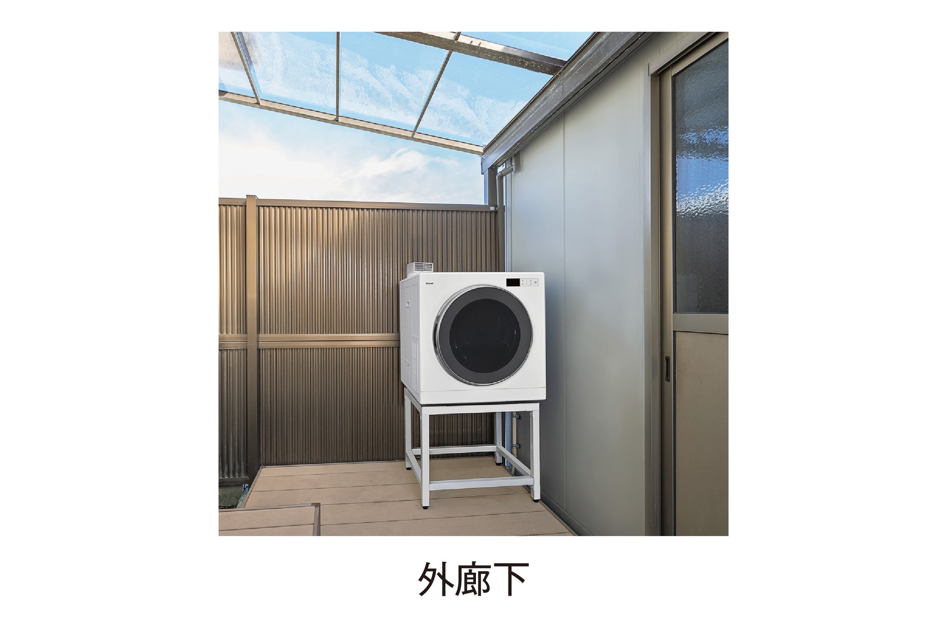 「乾太くんデラックスタイプ」の軒下設置用モデルは、雨や水が直接かからない屋外の軒下設置に対応します。戸建てや集合住宅のベランダ、庭のデッキ、外廊下などの軒下を活用することで、屋内での設置場所の確保や排湿管の穴あけ工事が難しい場合でも導入できます。