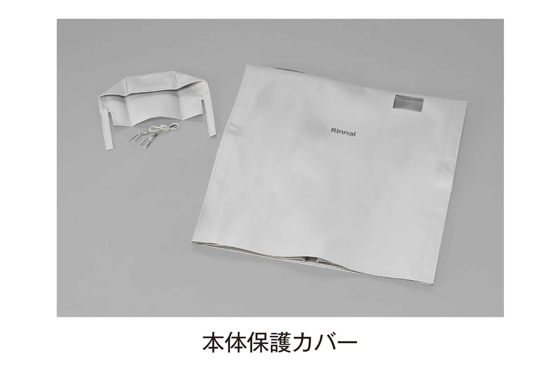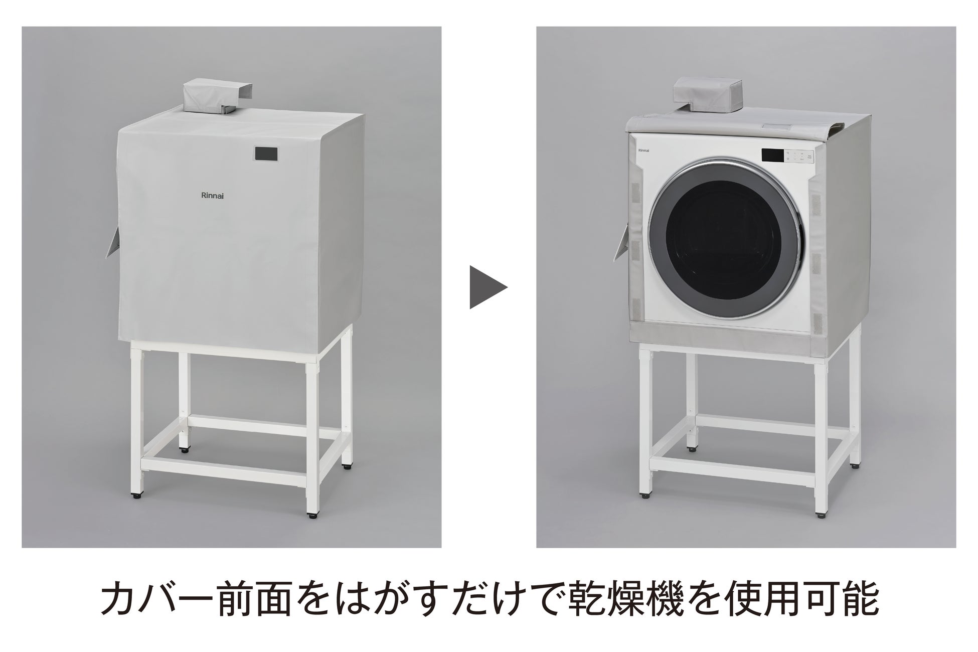 「乾太くんデラックスタイプ」軒下設置用モデルには、雨や粉塵から守る本体保護カバーと、乾燥機庫内で発生する水蒸気を外へ排出する排湿トップが付属しています。本体保護カバーを取り付けた後は、カバー前面の面ファスナーをはがし、2つ折りにして上に置くだけで乾燥機を使用することができるため、洗濯物の出し入れが簡単です。乾燥機はカバー前面を閉じた状態で運転することができます。