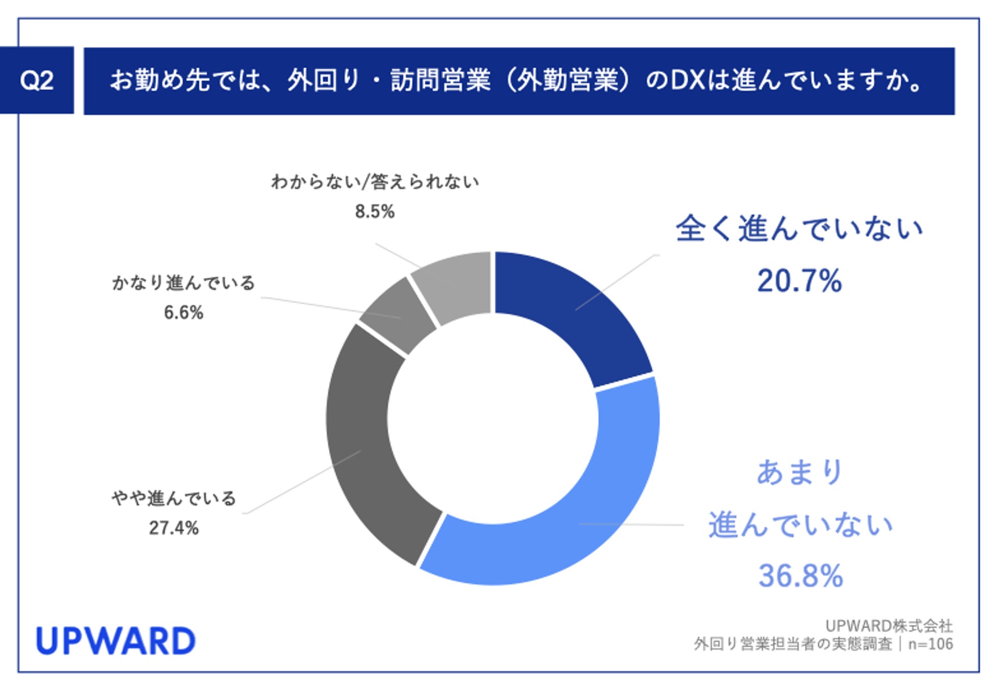 「Q2.お勤め先では、外回り・訪問営業(外勤営業)のDXは進んでいますか。」(n=106)と質問したところ、「全く進んでいない」が20.7%、「あまり進んでいない」が36.8%という回答となりました。
