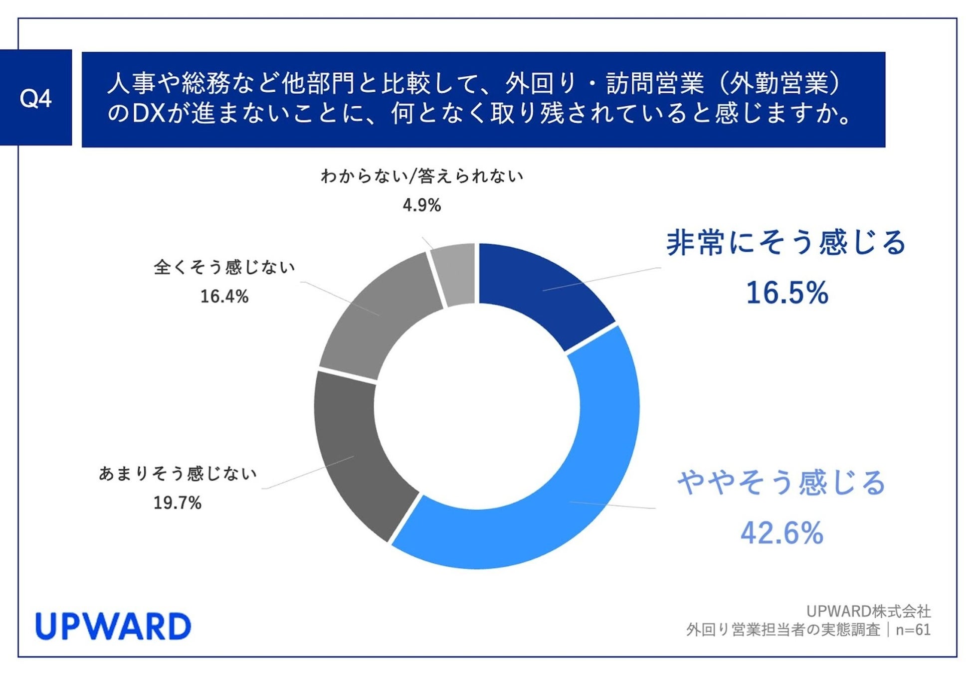 Q2で「あまり進んでいない」「全く進んでいない」と回答した方に、「Q4.人事や総務など他部門と比較して、外回り・訪問営業(外勤営業)のDXが進まないことに、何となく取り残されていると感じますか。」(n=61)と質問したところ、「非常にそう感じる」が16.5%、「ややそう感じる」が42.6%という回答となりました。