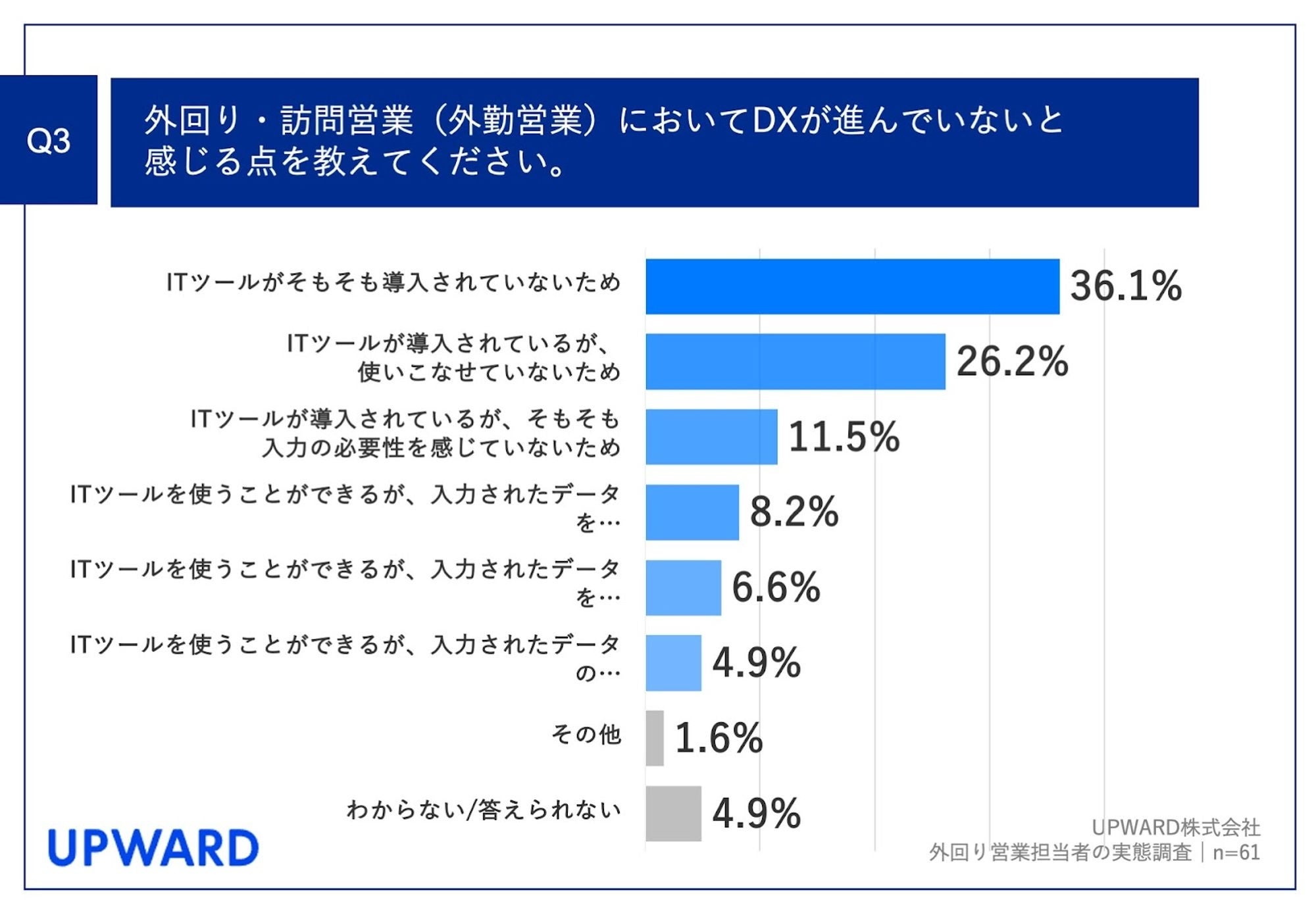 UPWARD株式会社(本社:東京都千代田区、代表取締役社長 CEO:金木 竜介)は、外回り営業を行う営業担当者106名を対象に、外回り営業担当者の実態調査を実施しましたので、お知らせいたします。