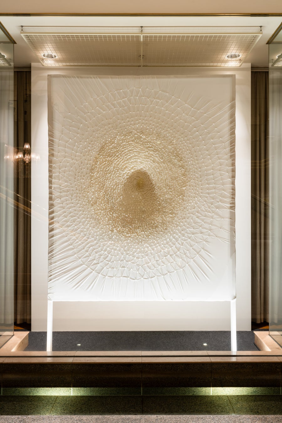 今回の「Drifting between the Waves –波間に揺蕩う–」は、ホテルから見える横浜の海の寄せては返す波のように、作品から生まれる揺蕩うような感覚を通じて、日常の緊張を解きほぐし、見る人の心をゆるやかに解き放つようなインスタレーション空間となっており、まるで訪れる人をホテルでの寛ぎのひとときへ誘うかのようです。