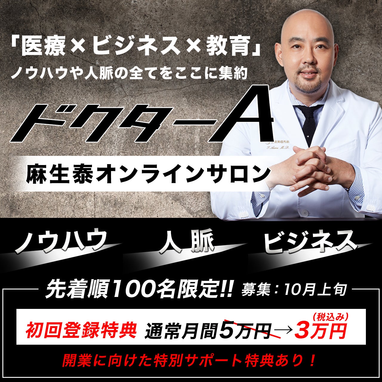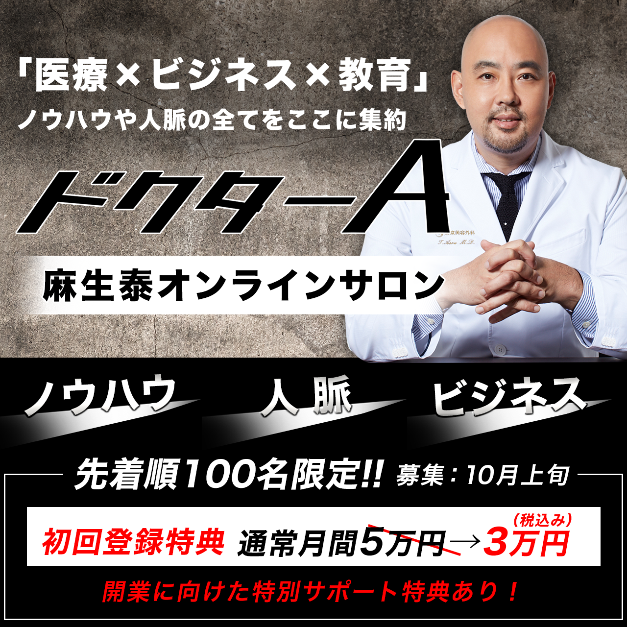 ドクターAこと麻生泰の「医療×ビジネス×教育」に完全特化したオンラインサロンを開設!開業に向けた特別サポート特典もお見逃しなく!
