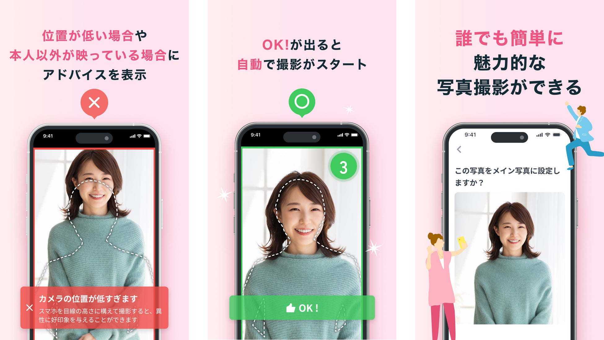 アプリ内でカメラを起動するだけで、最適なプロフィール写真の撮影をサポートします。